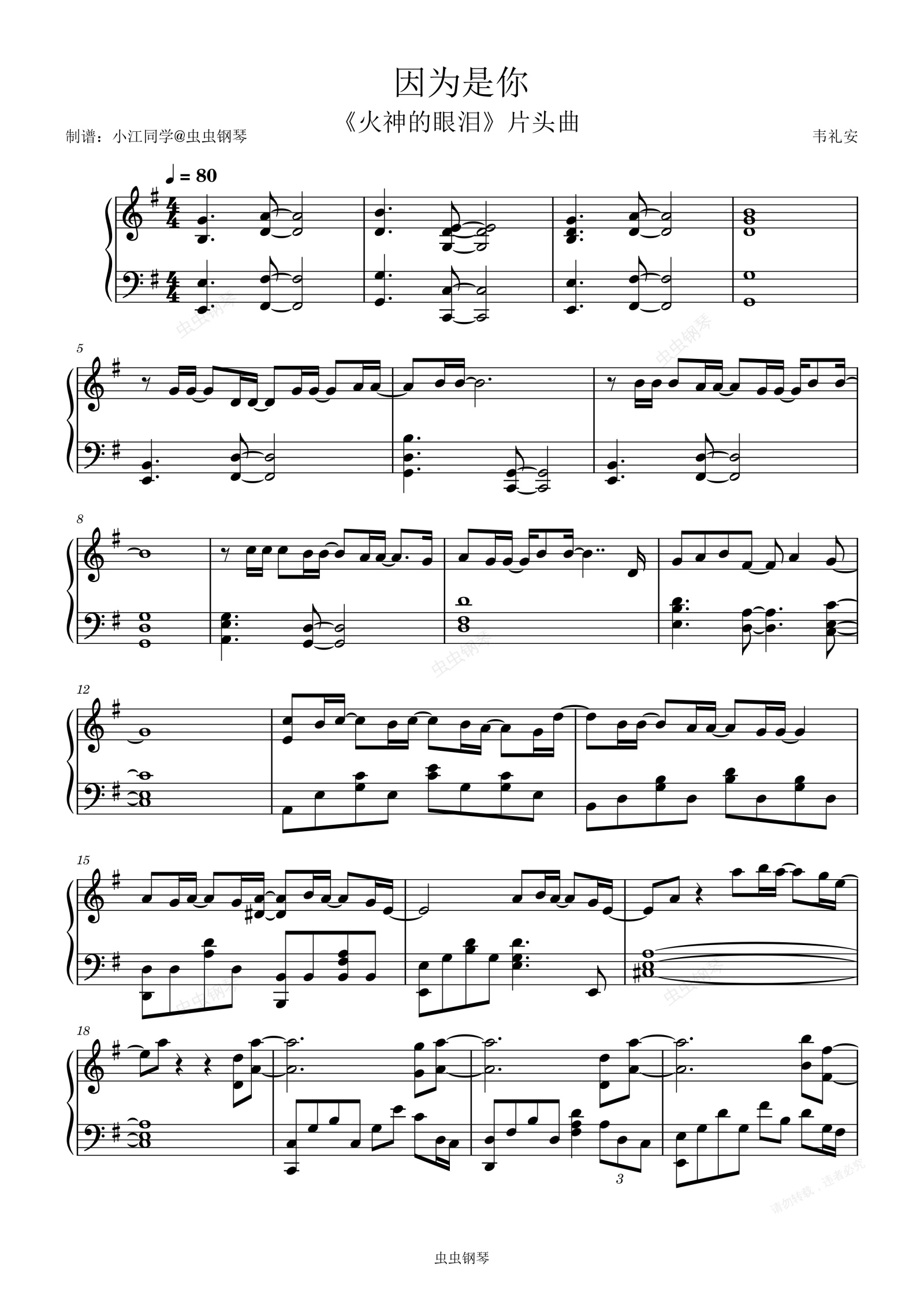 钢琴谱:因为是你 韦礼安《火神的眼泪》片头曲