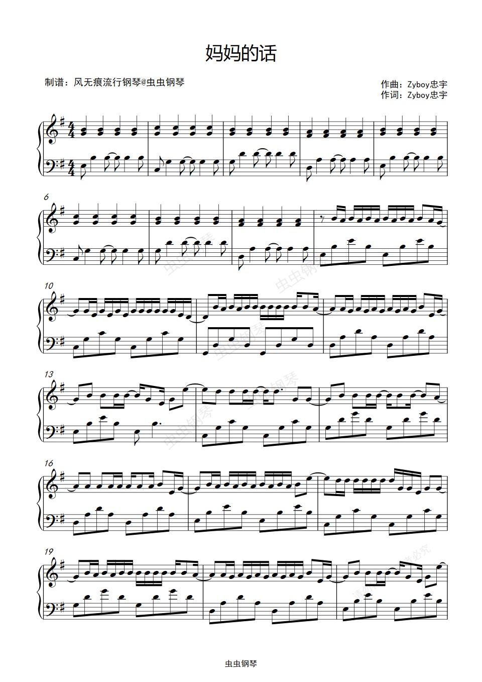 钢琴谱:G调-妈妈的话-Zyboy忠宇