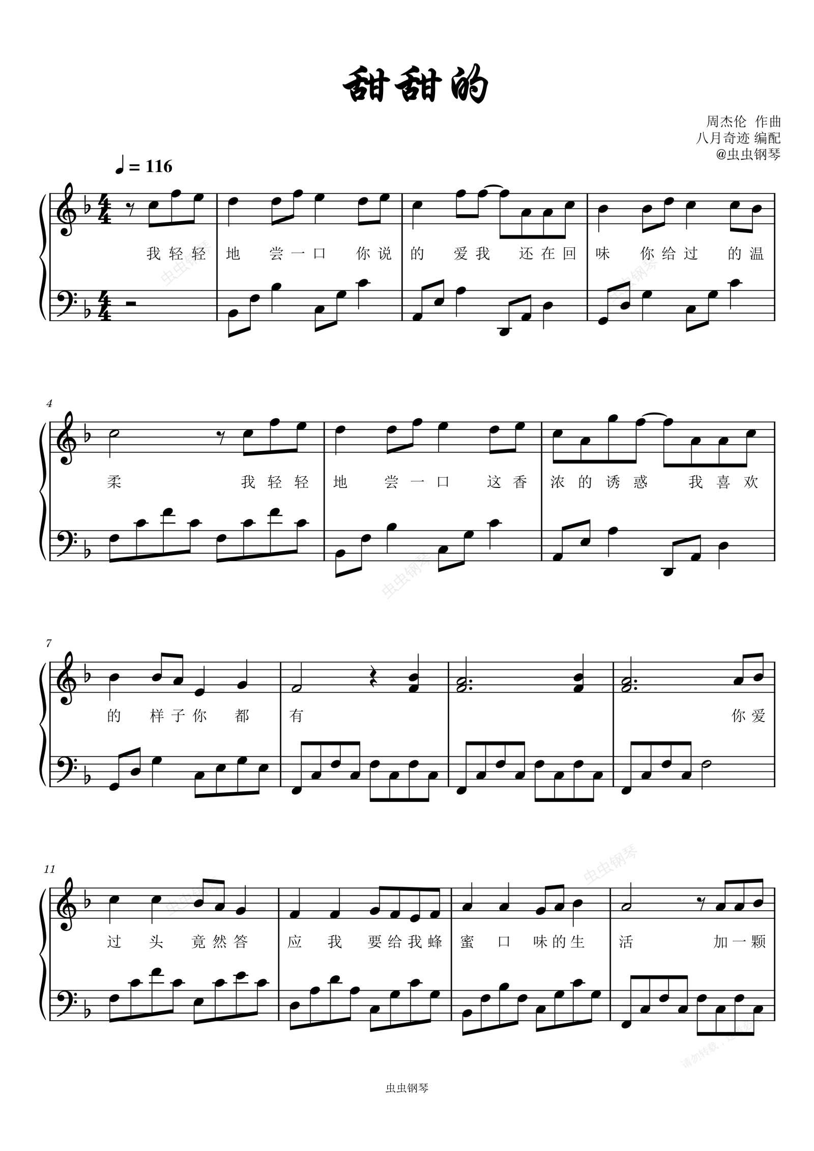 钢琴谱:周杰伦《甜甜的》F大调带歌词,精编版
