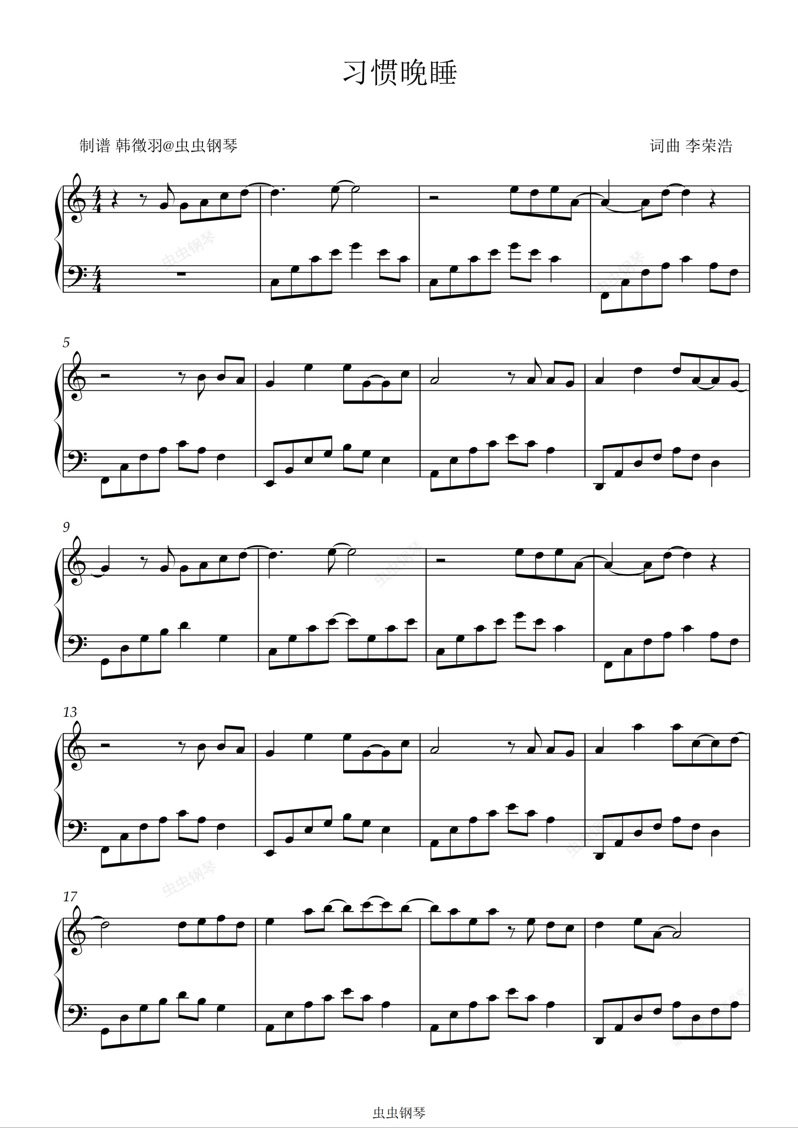 钢琴谱:李荣浩 习惯晚睡 C调简单易弹