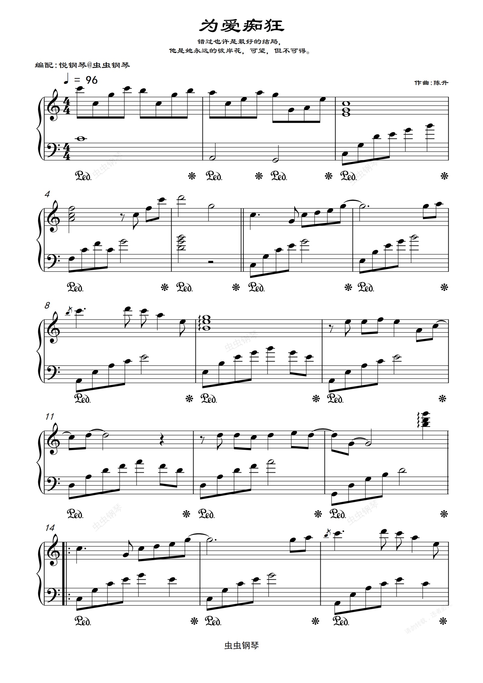 钢琴谱:为爱痴狂 (C调抒情版)刘若英