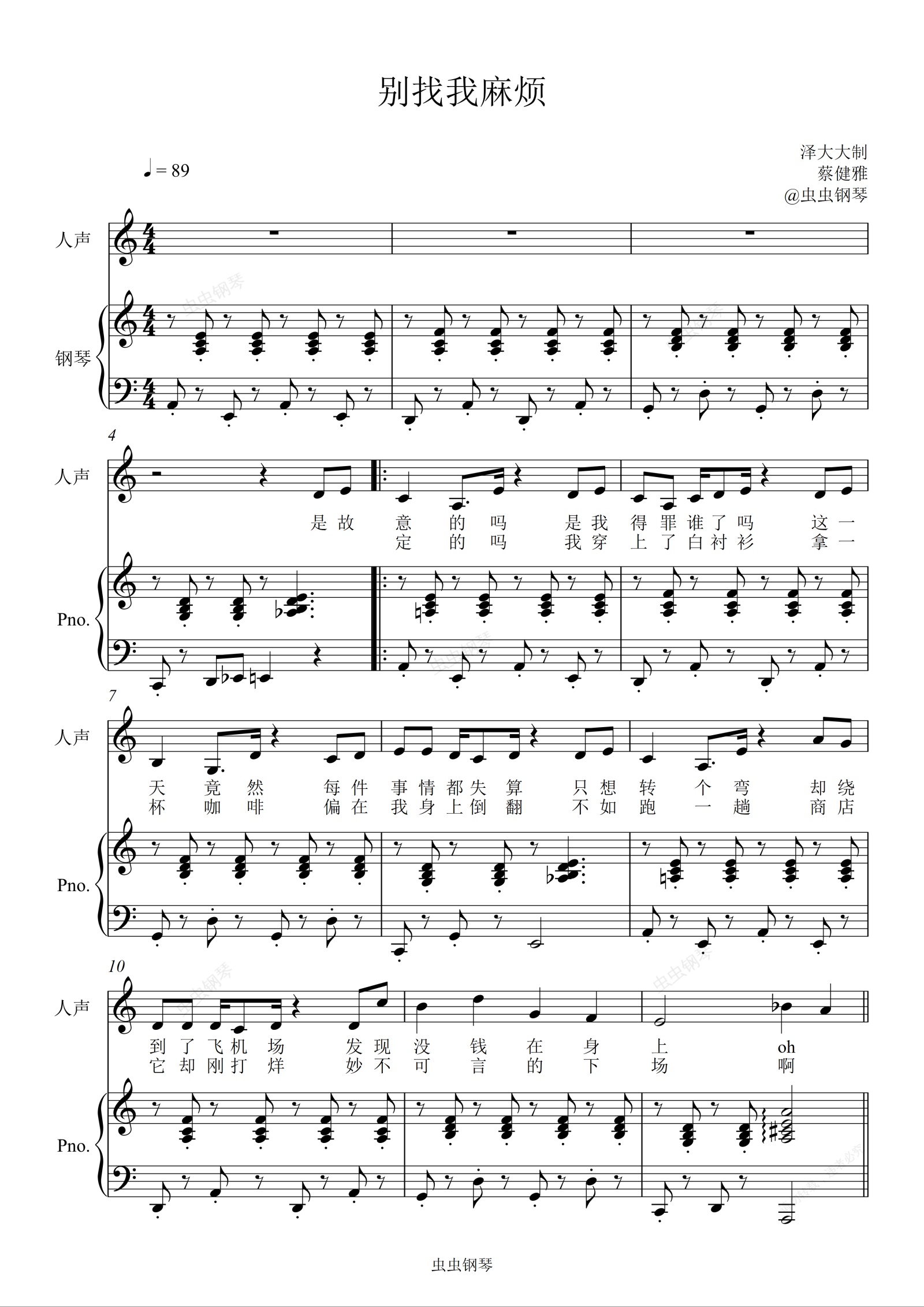钢琴谱:别找我麻烦【a小调弹唱附词】泽大大 蔡健雅