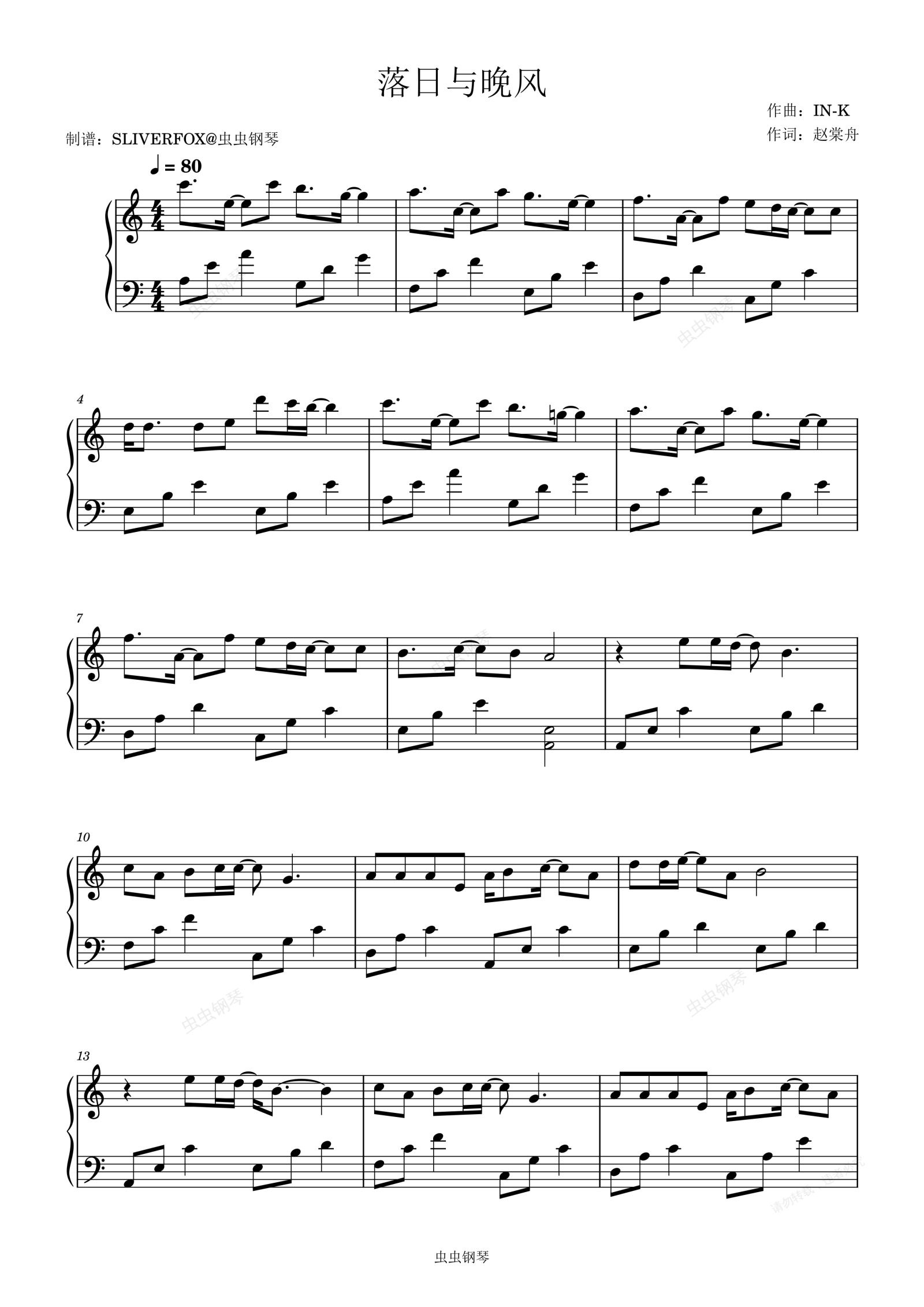 钢琴谱:《落日与晚风》 C调流行钢琴曲 王忻辰/苏星婕