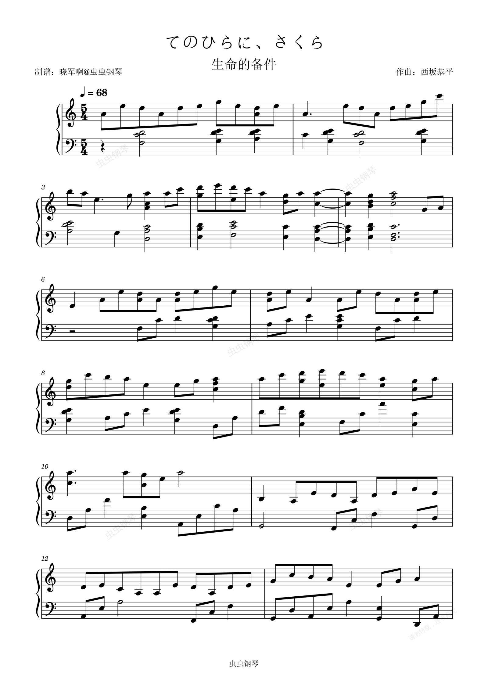 钢琴谱:【生命的备件】てのひらに、さくら