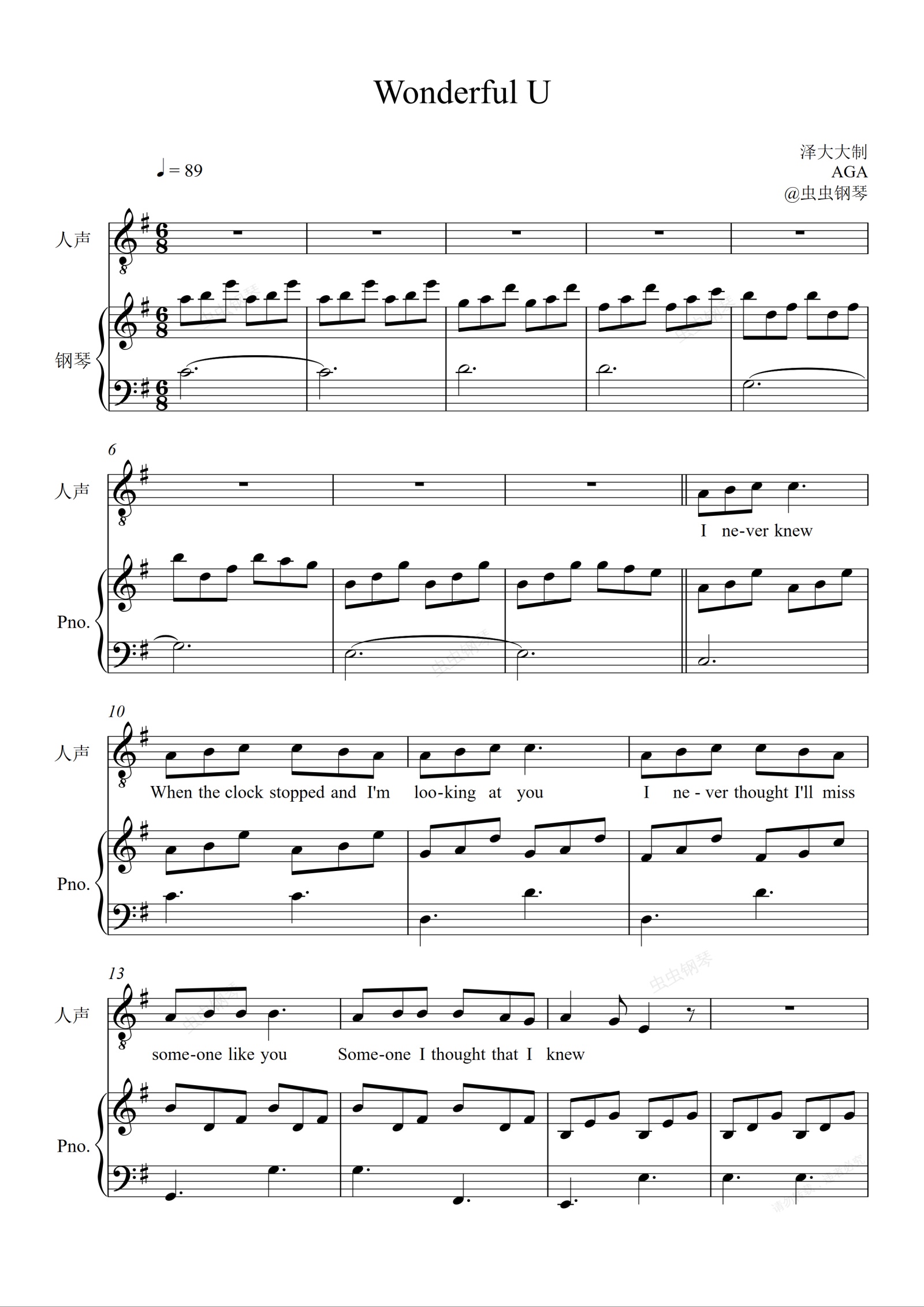 钢琴谱:Wonderful U【G调完美弹唱附词】泽大大 AGA