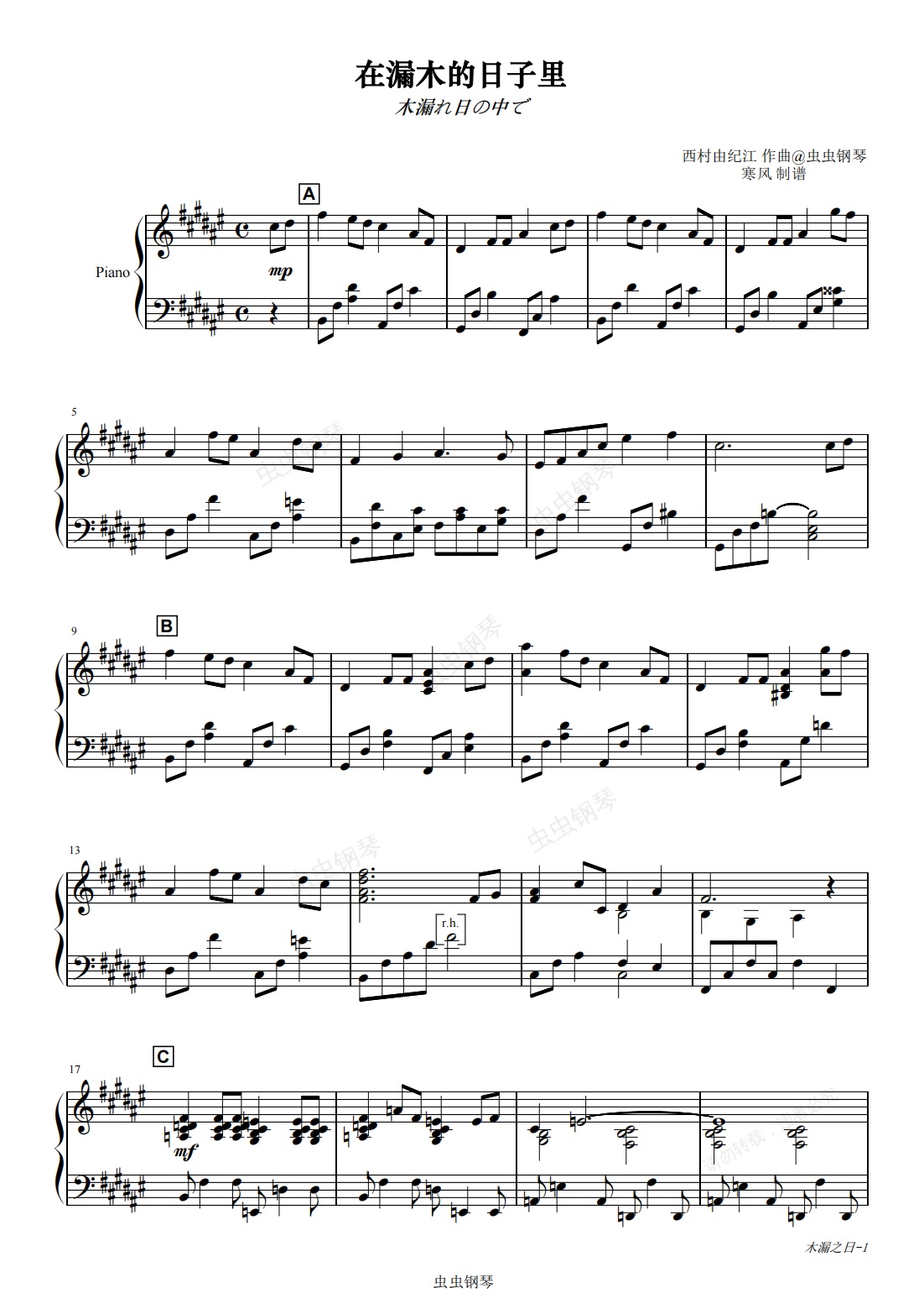 钢琴谱:在漏木的日子里/木漏れ日の中で