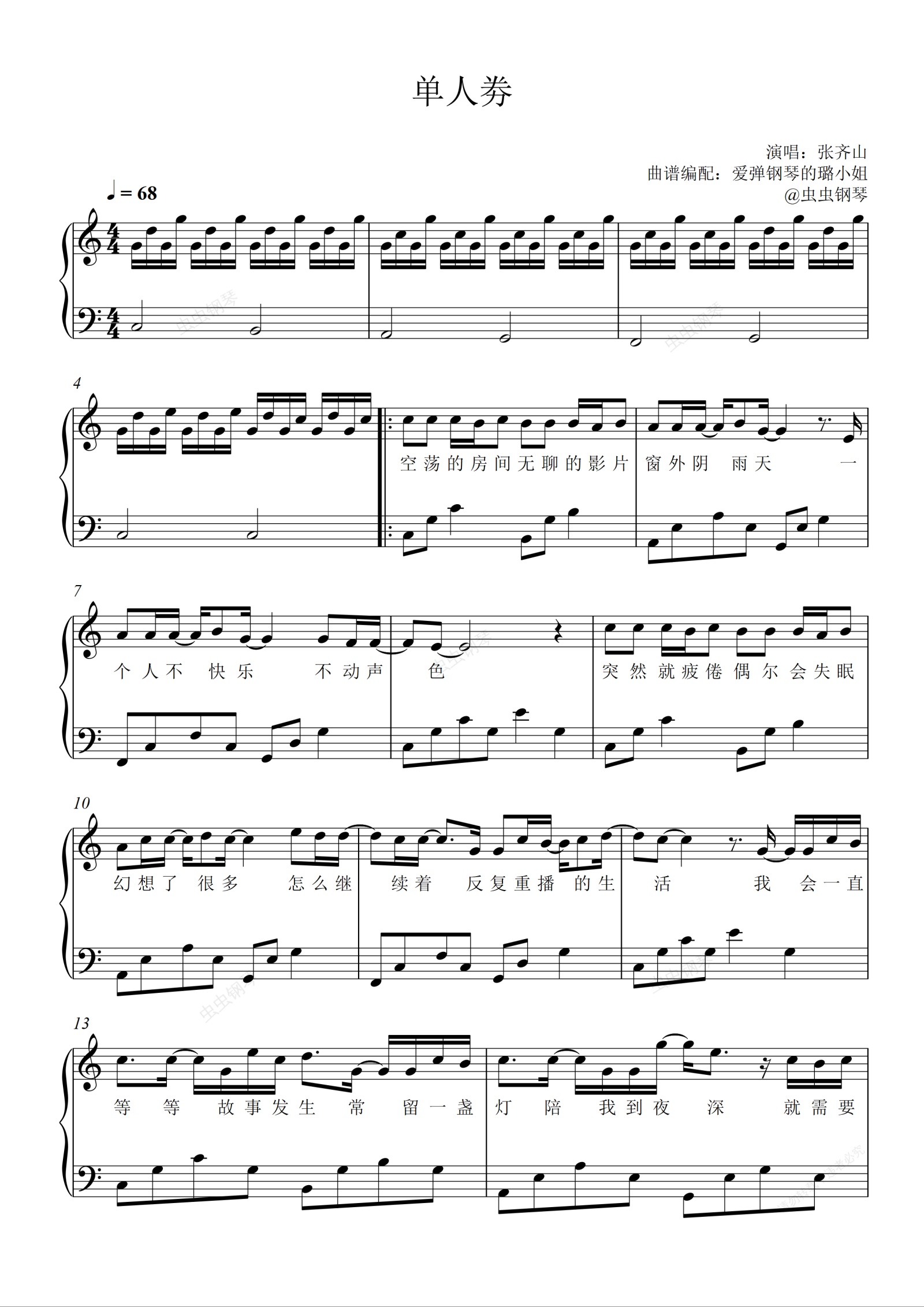 钢琴谱:单人劵 - C调简易版 - 附歌词(适合初学者)