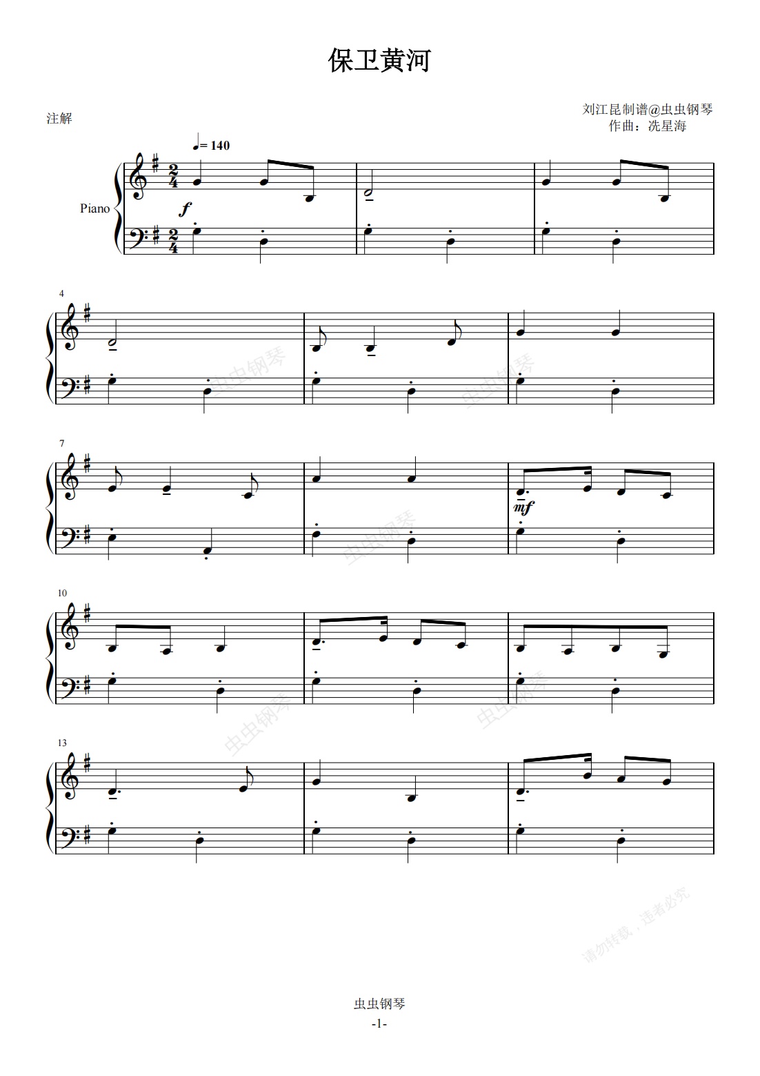 钢琴谱:保卫黄河(钢琴基础第一册版本)