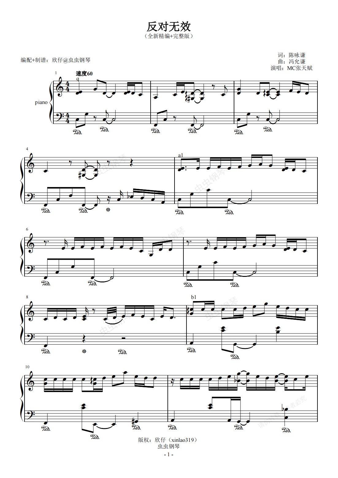 钢琴谱:MC张天赋-C《反对无效》(全新精编+完整版)