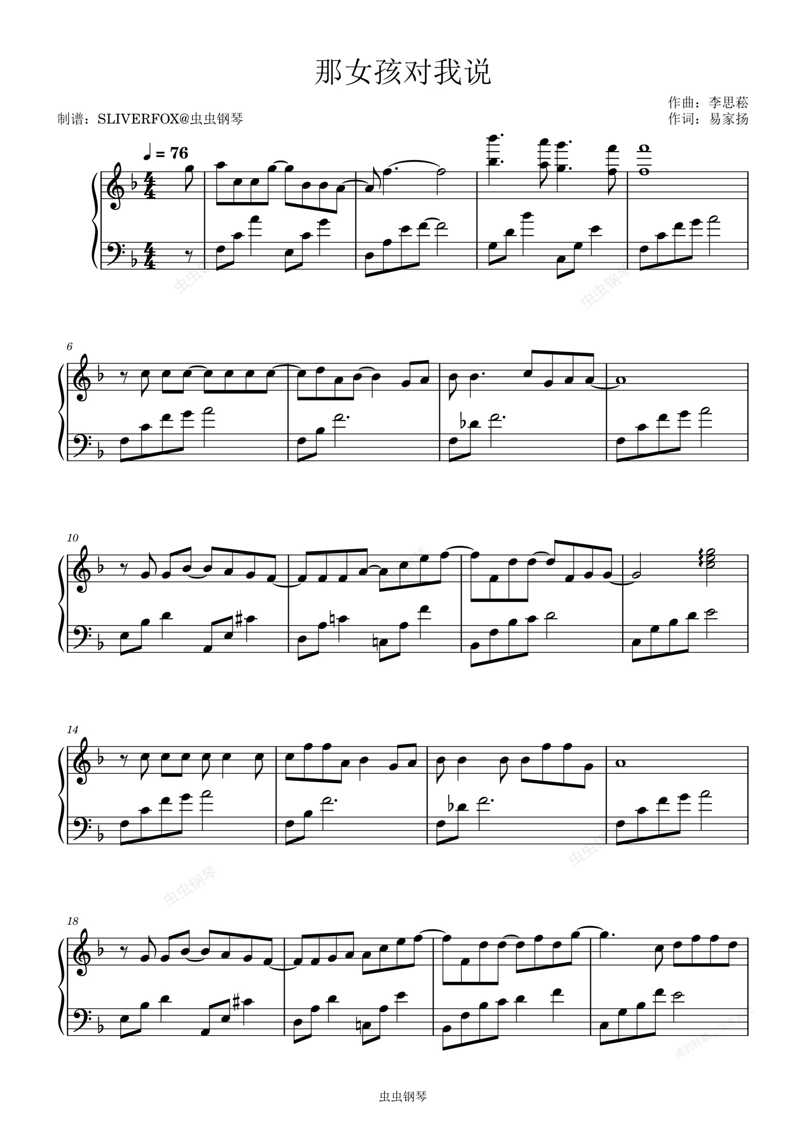 钢琴谱:《那女孩对我说》 成人流行钢琴谱F调