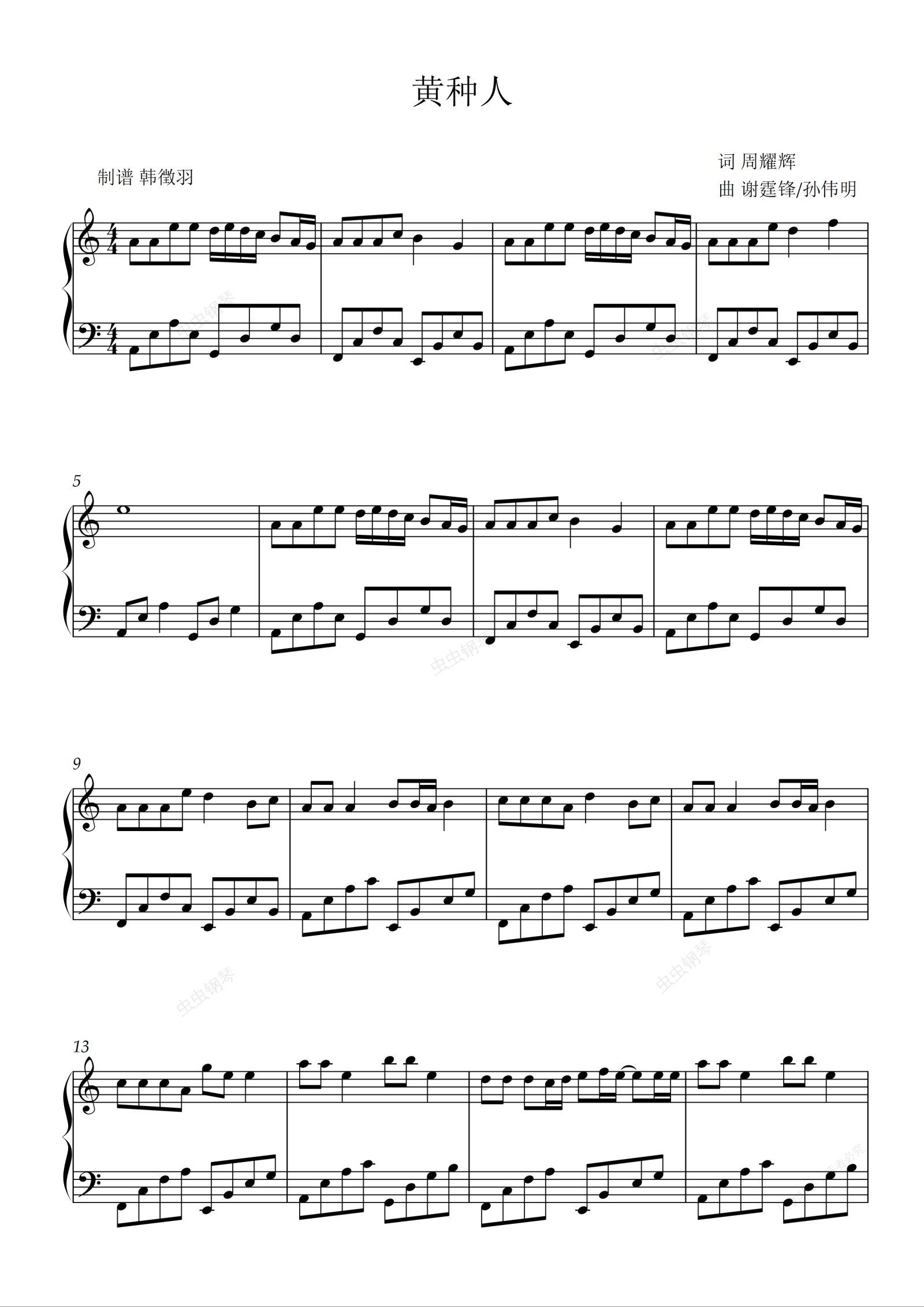 钢琴谱:黄种人 谢霆锋 C调简易版