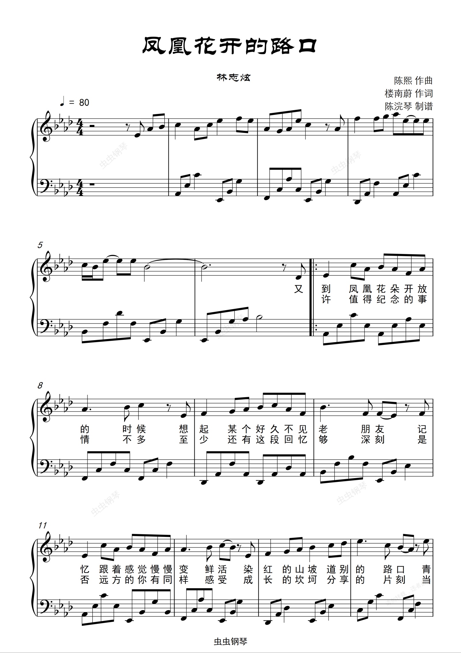 钢琴谱:凤凰花开的路口钢琴谱简单版_原调五线谱_林志炫