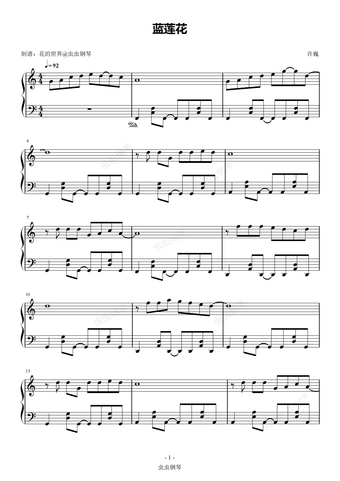 钢琴谱:蓝莲花 C调简易版 许巍 流行经典