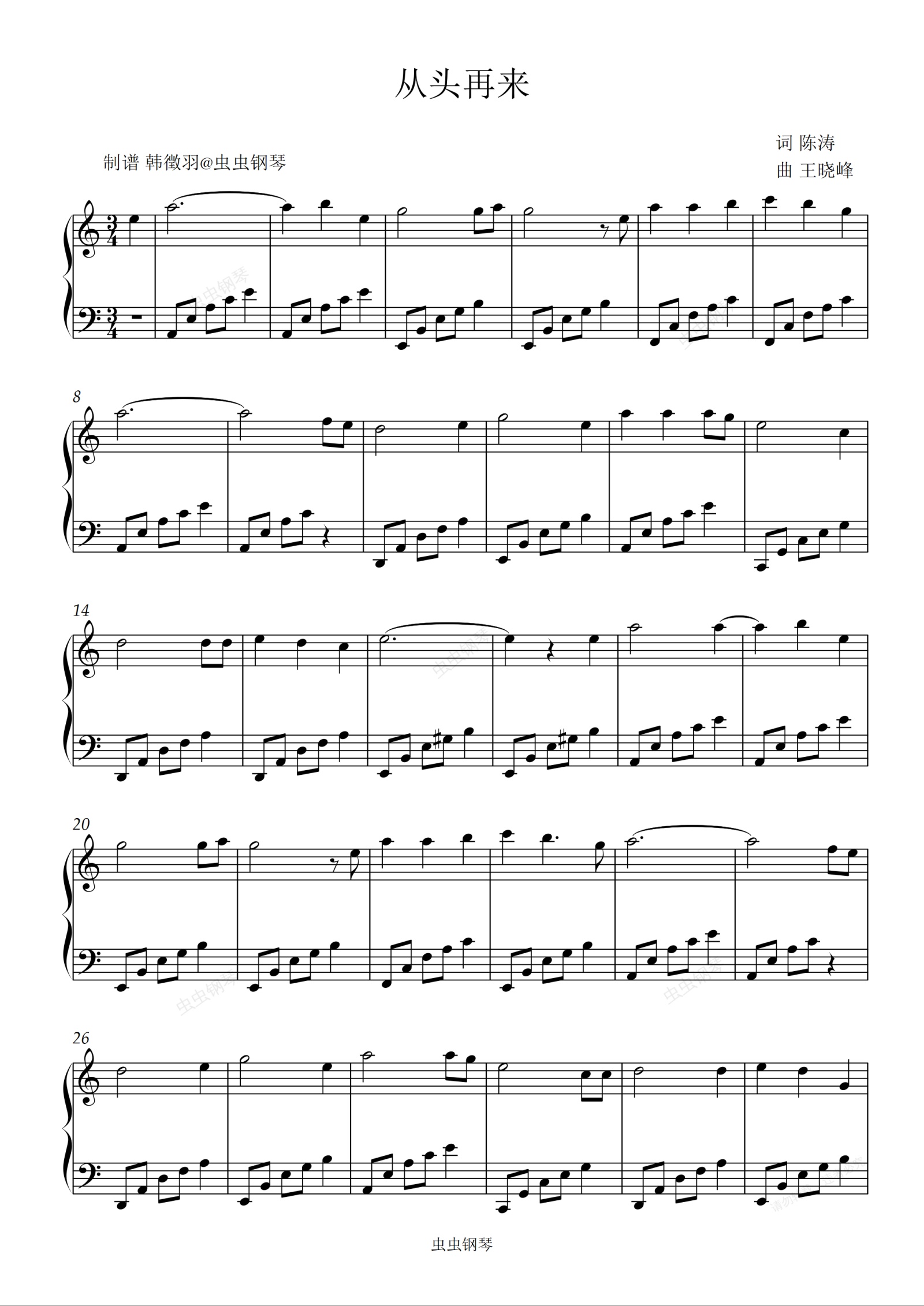 钢琴谱:从头再来 刘欢 C调简单易弹