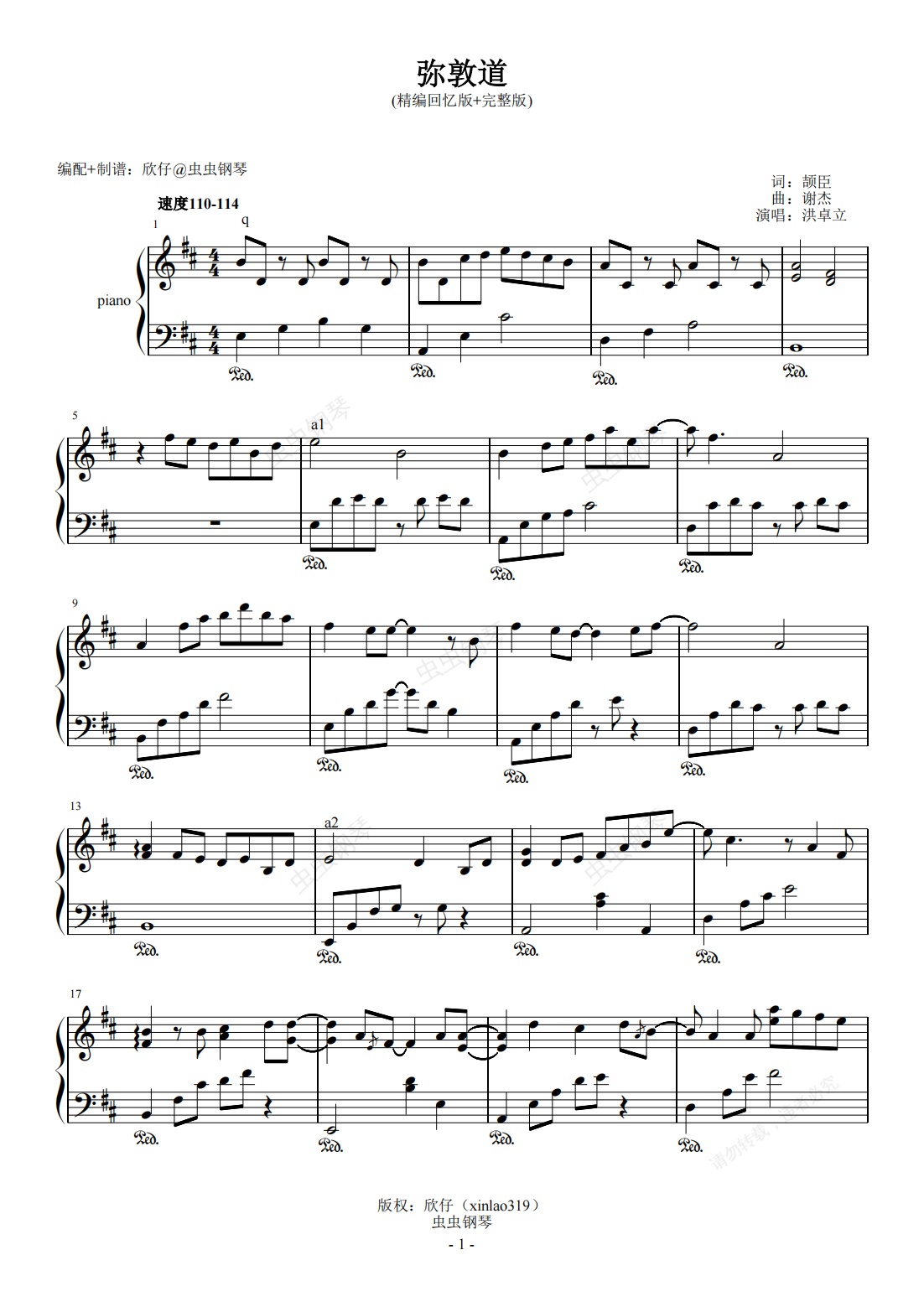 钢琴谱:洪卓立-D《弥敦道》(精编回忆+完整版)