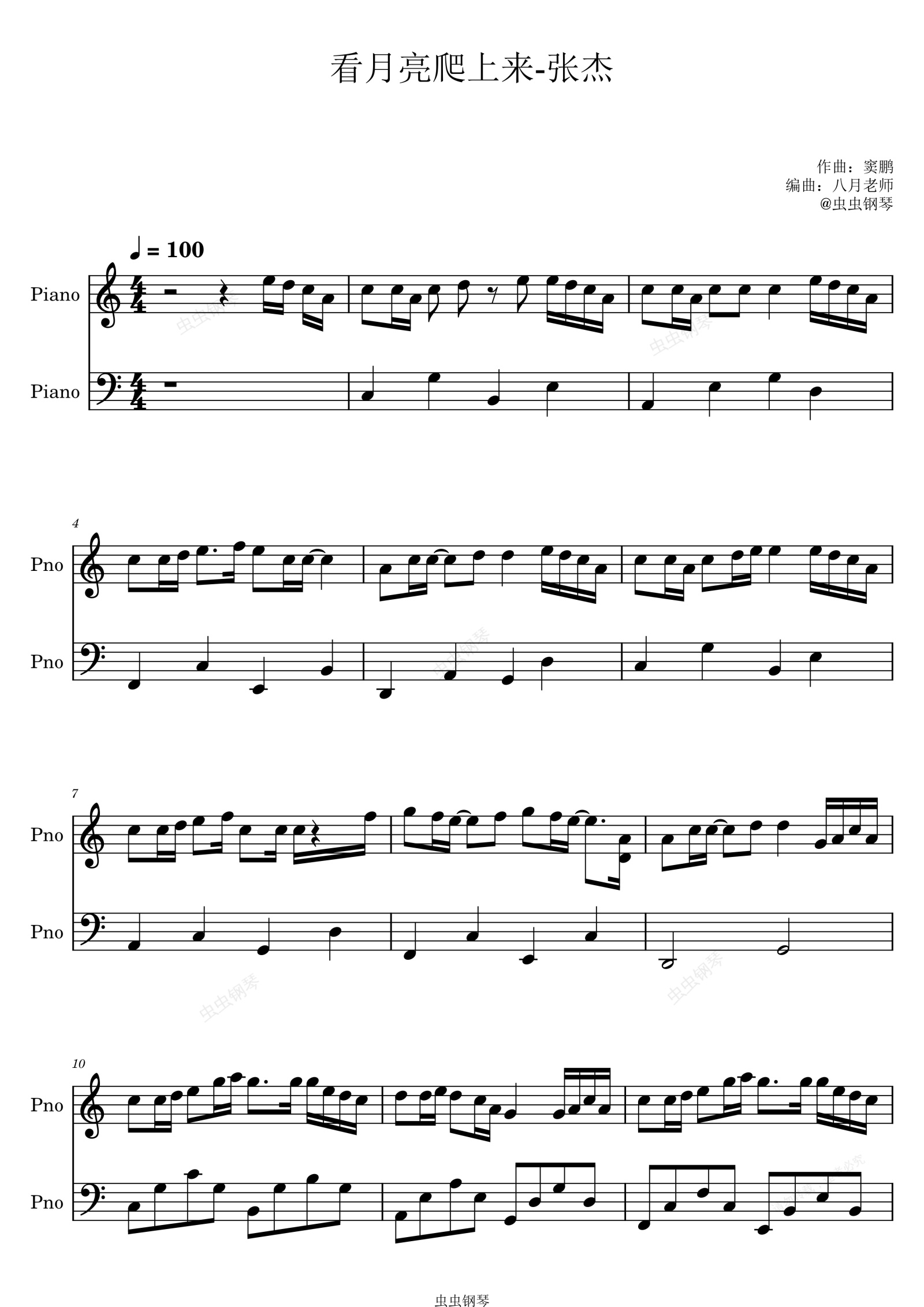 钢琴谱:看月亮爬上来-C调简单版- 张杰