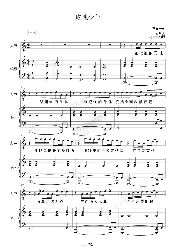 钢琴谱:玫瑰少年【女生a小调弹唱附词】泽大大 五月天