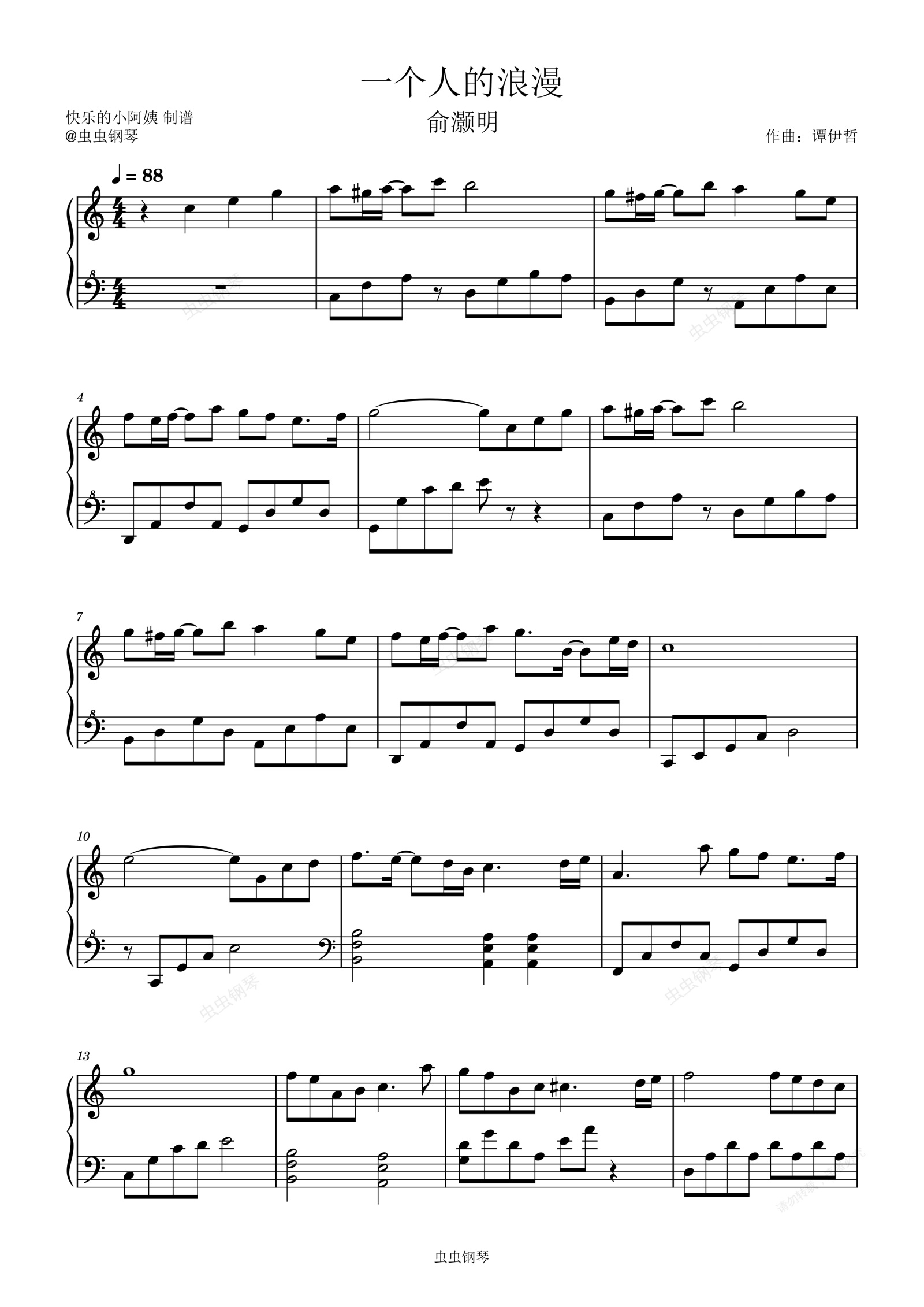 钢琴谱:一个人的浪漫-C调简易版