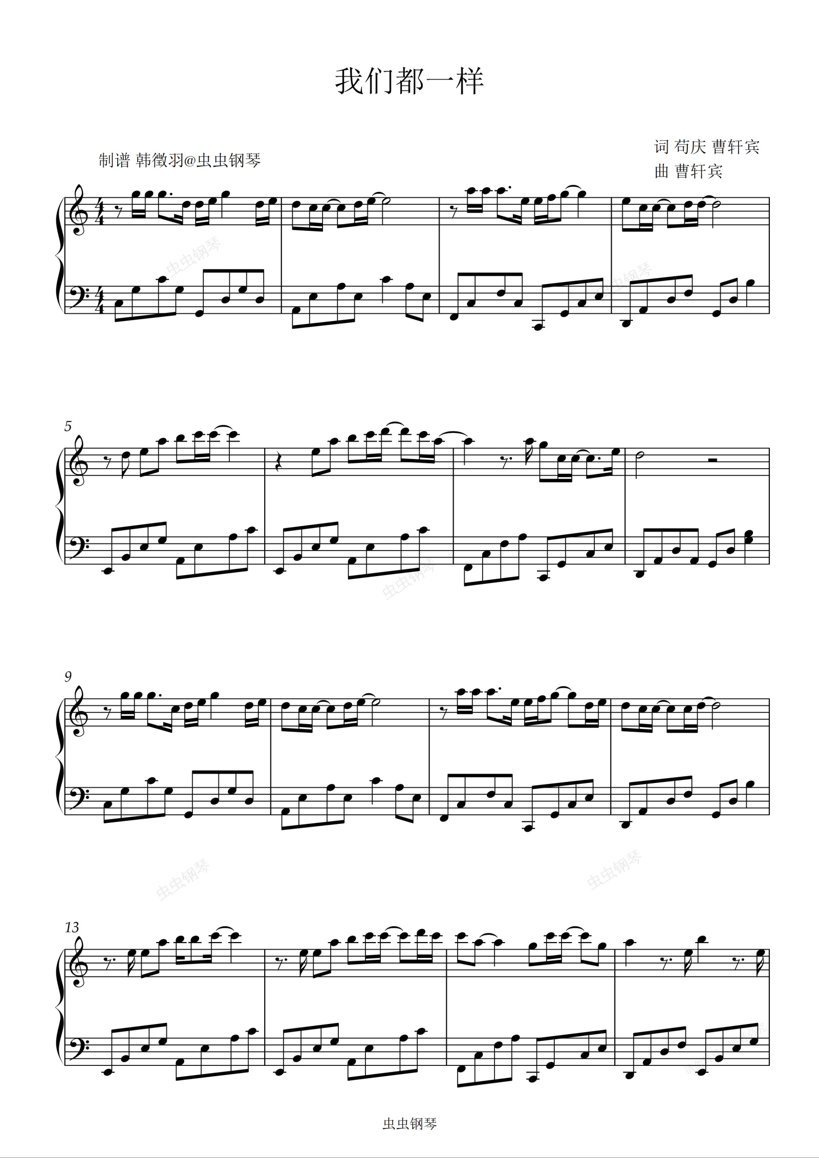 钢琴谱:我们都一样 张杰 C调简易版