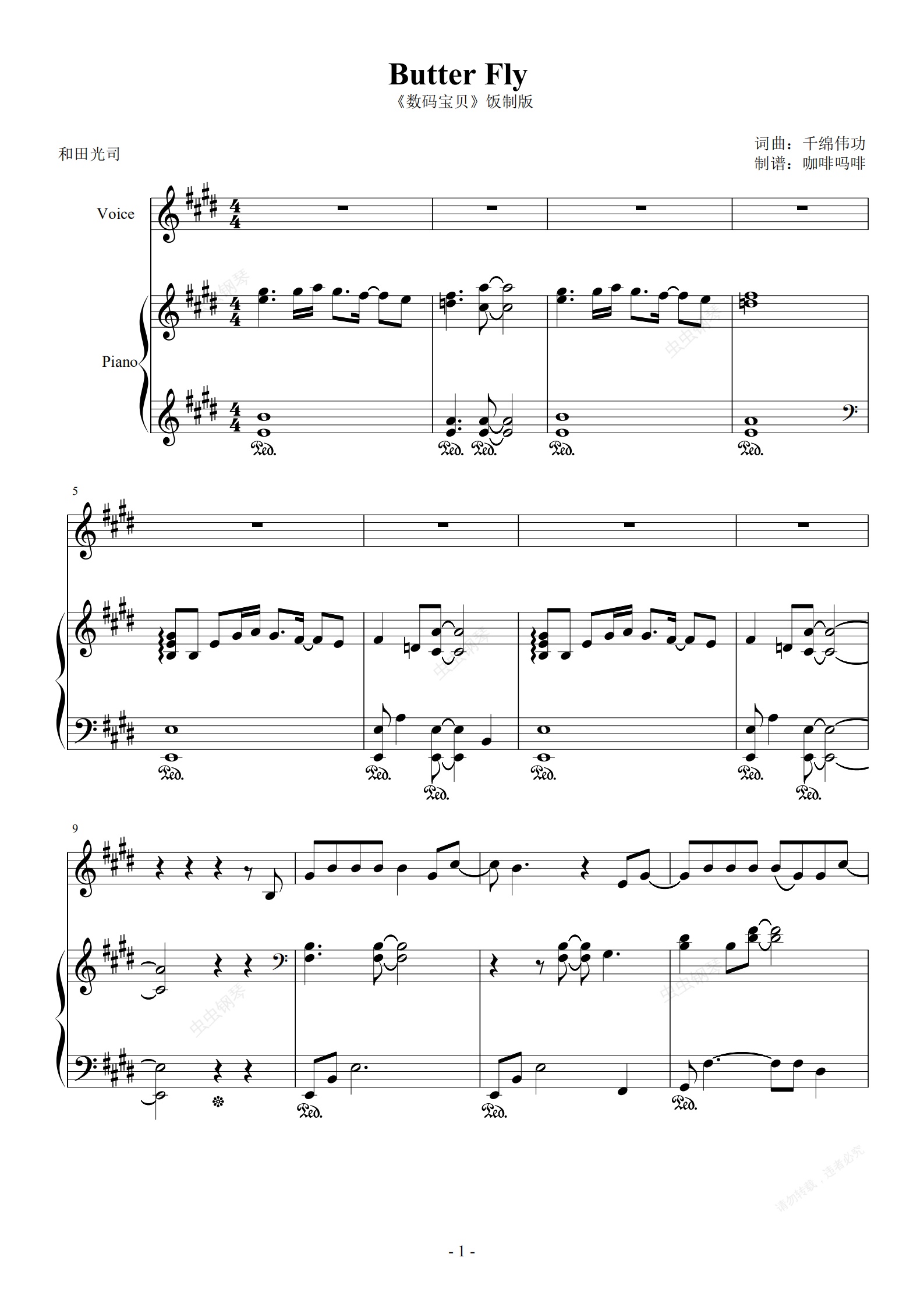 钢琴谱:Butter Fly -《数码宝贝》饭制版伴奏谱