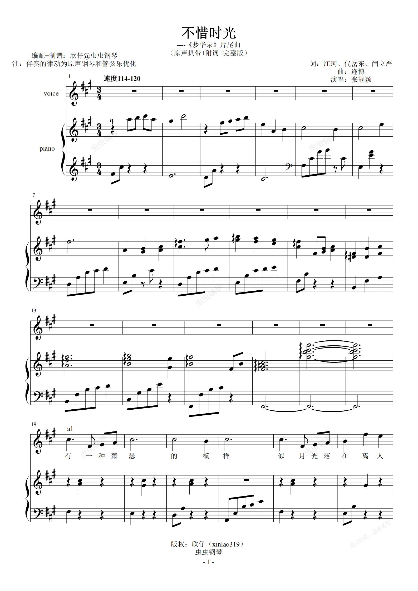钢琴谱:(伴)张靓颖-A《不惜时光》(原声扒带优化+附词+完整版)