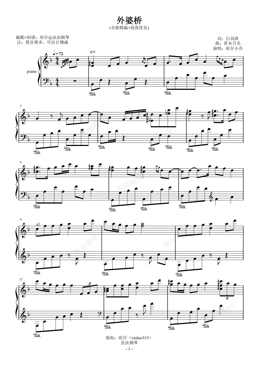 钢琴谱:旺仔小乔-F《外婆桥》(全新精编+段落优化)