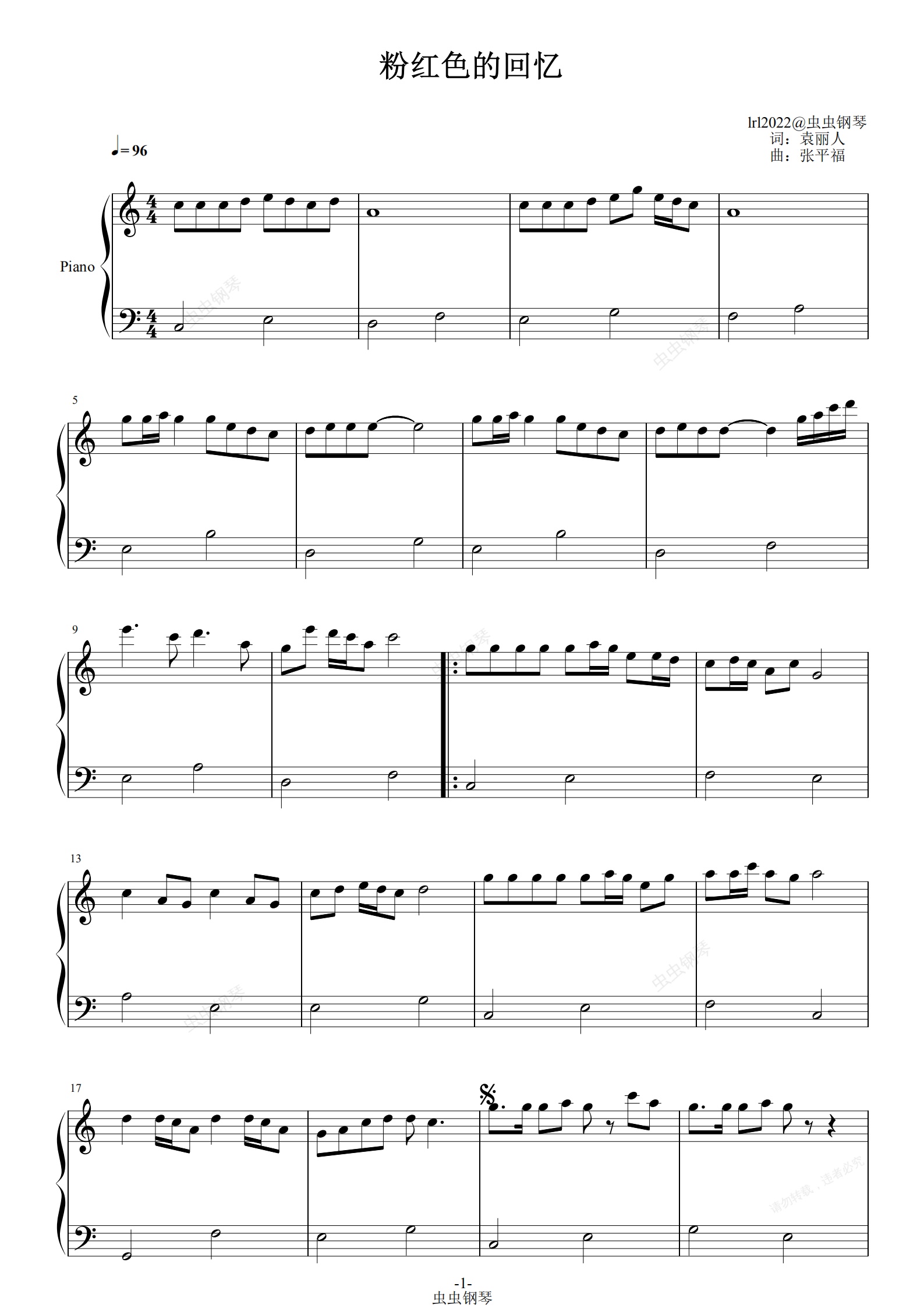 钢琴谱:《粉红色的回忆》-C调-简单版-独奏-钢琴谱-韩宝仪