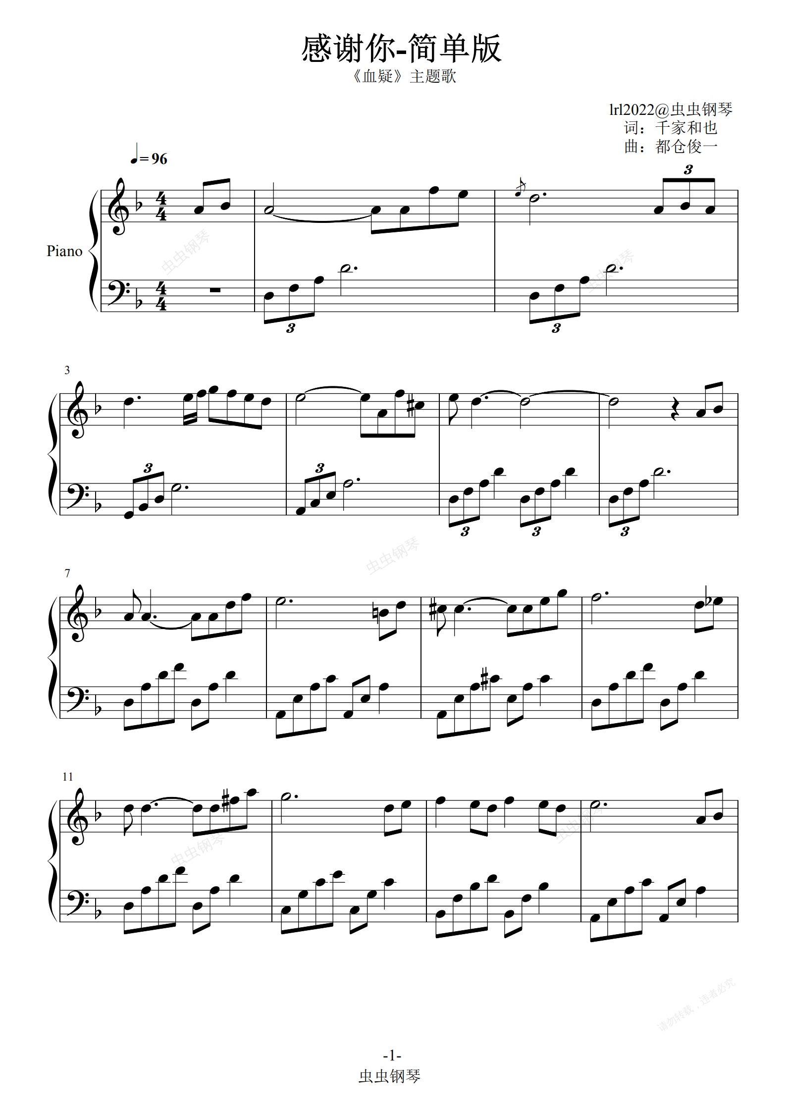 钢琴谱:《感谢你/ありがとうあなた》-简化版-《血疑》主题曲-独奏-钢琴谱