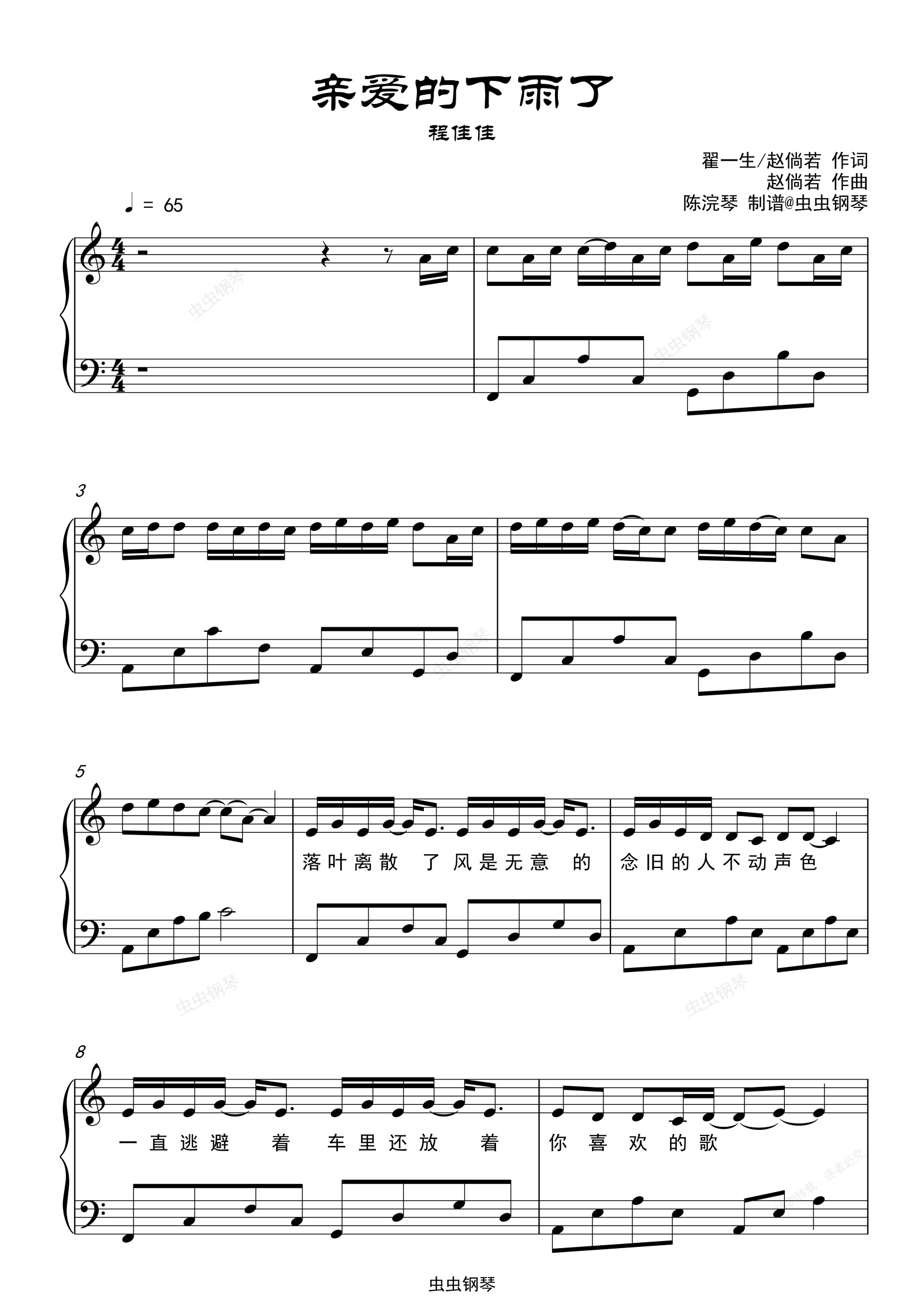 钢琴谱:亲爱的下雨了钢琴谱_C调五线谱_程佳佳