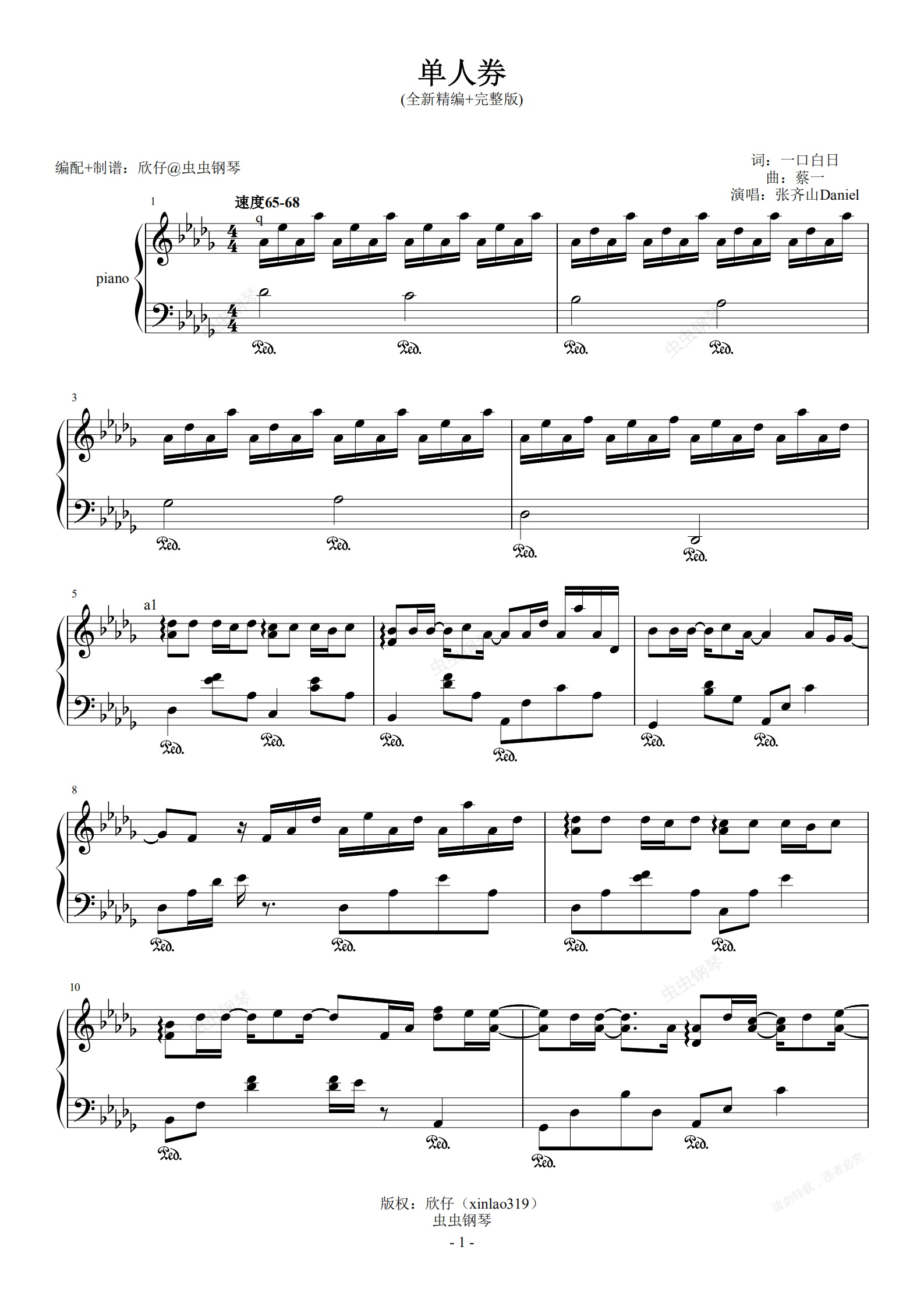 钢琴谱:张齐山DanieL-降D《单人券》(全新精编+完整版)