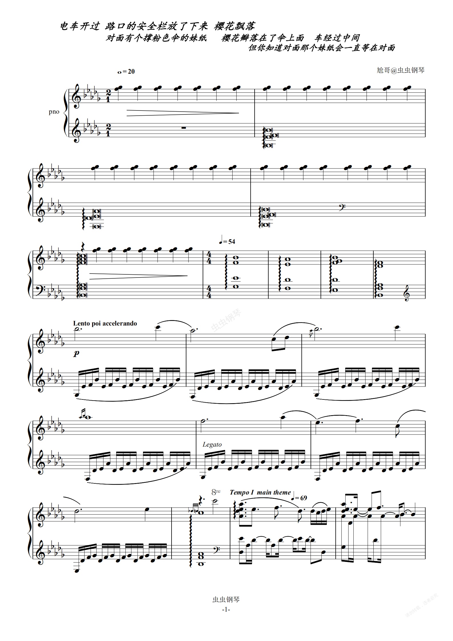 钢琴谱:电车开过路口的安全栏放了下来樱花飘落对面有个撑粉色伞的妹纸樱花瓣落在了伞上面车经过中间但你知道对面那个妹纸会一直等着在对面
