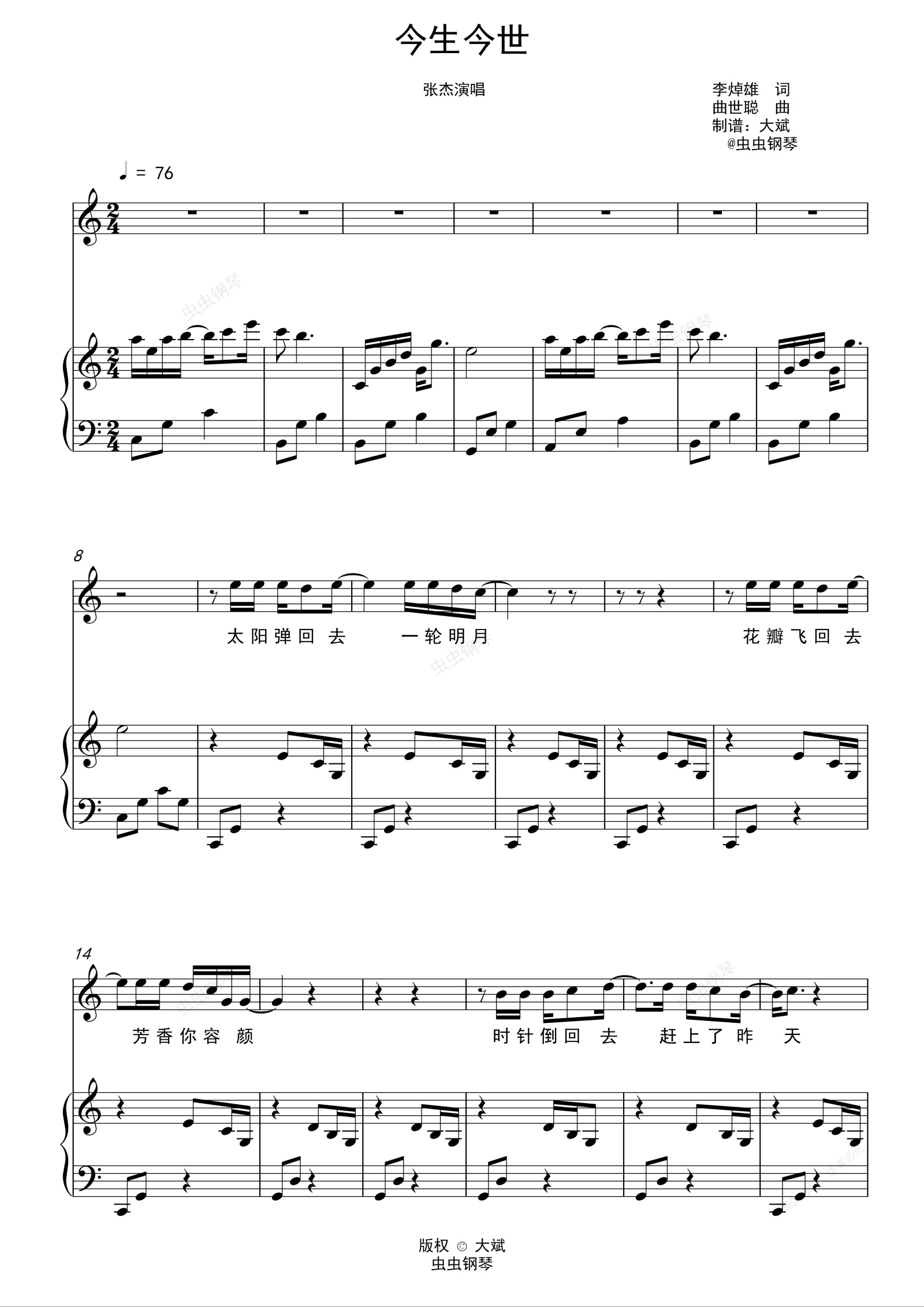 钢琴谱:今生今世-张杰(C调弹唱)