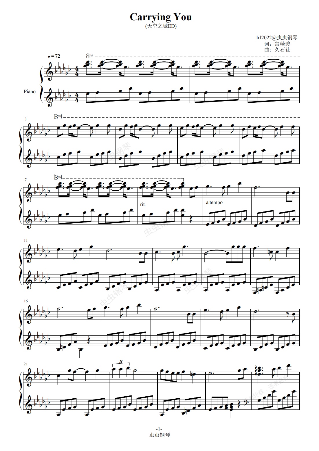 钢琴谱:君をのせて/Carrying You-降b调-伴随着你-天空之城ED-久石让