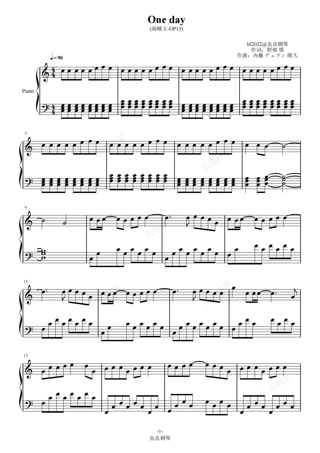 钢琴谱:One day-海贼王OP13-第13首主题曲-独奏版
