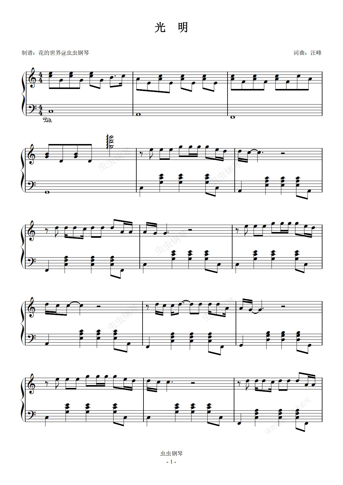 钢琴谱:光明 C调简易版 汪峰/谭艳