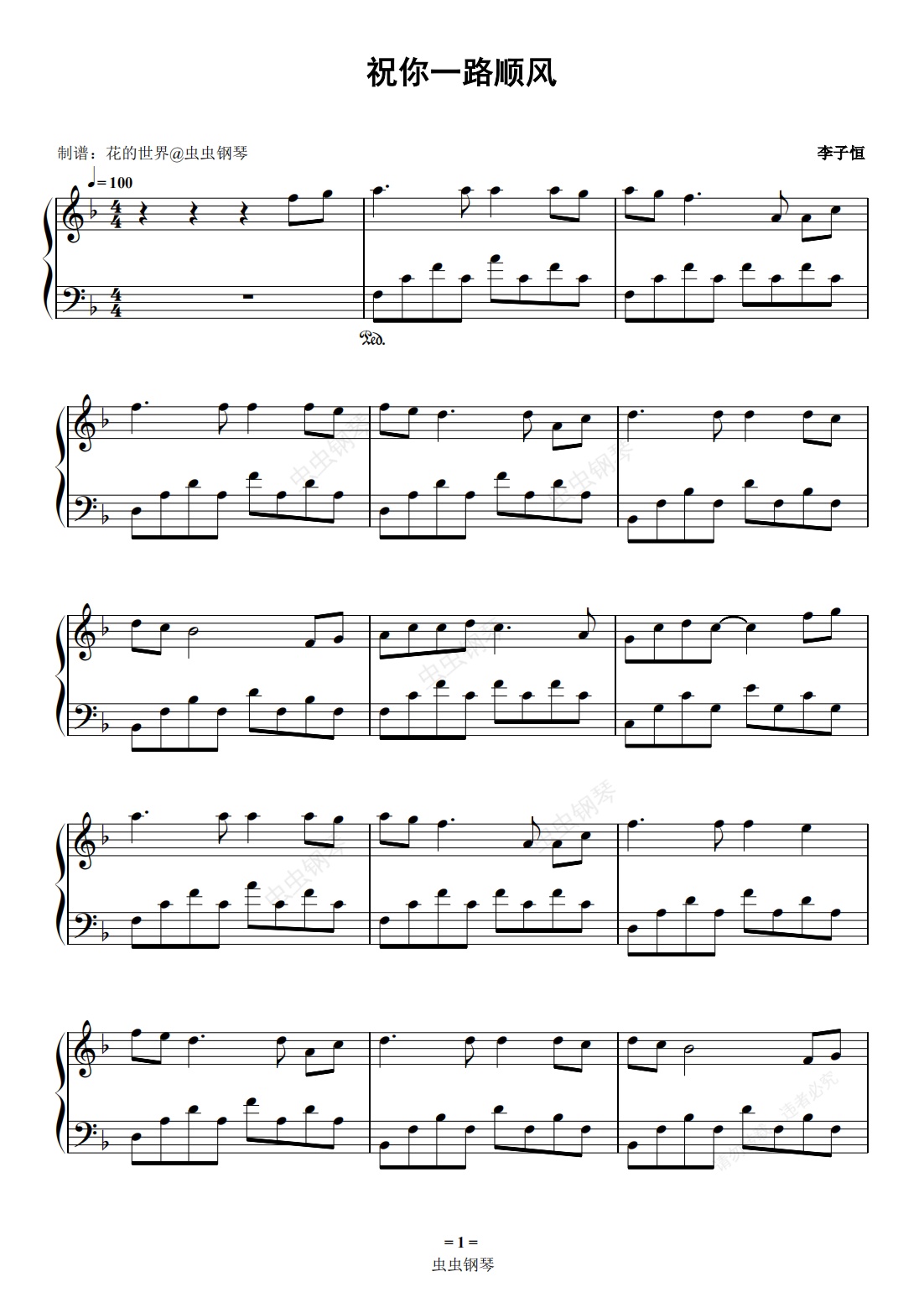 钢琴谱:祝你一路顺风 原调简易版本 吴奇隆
