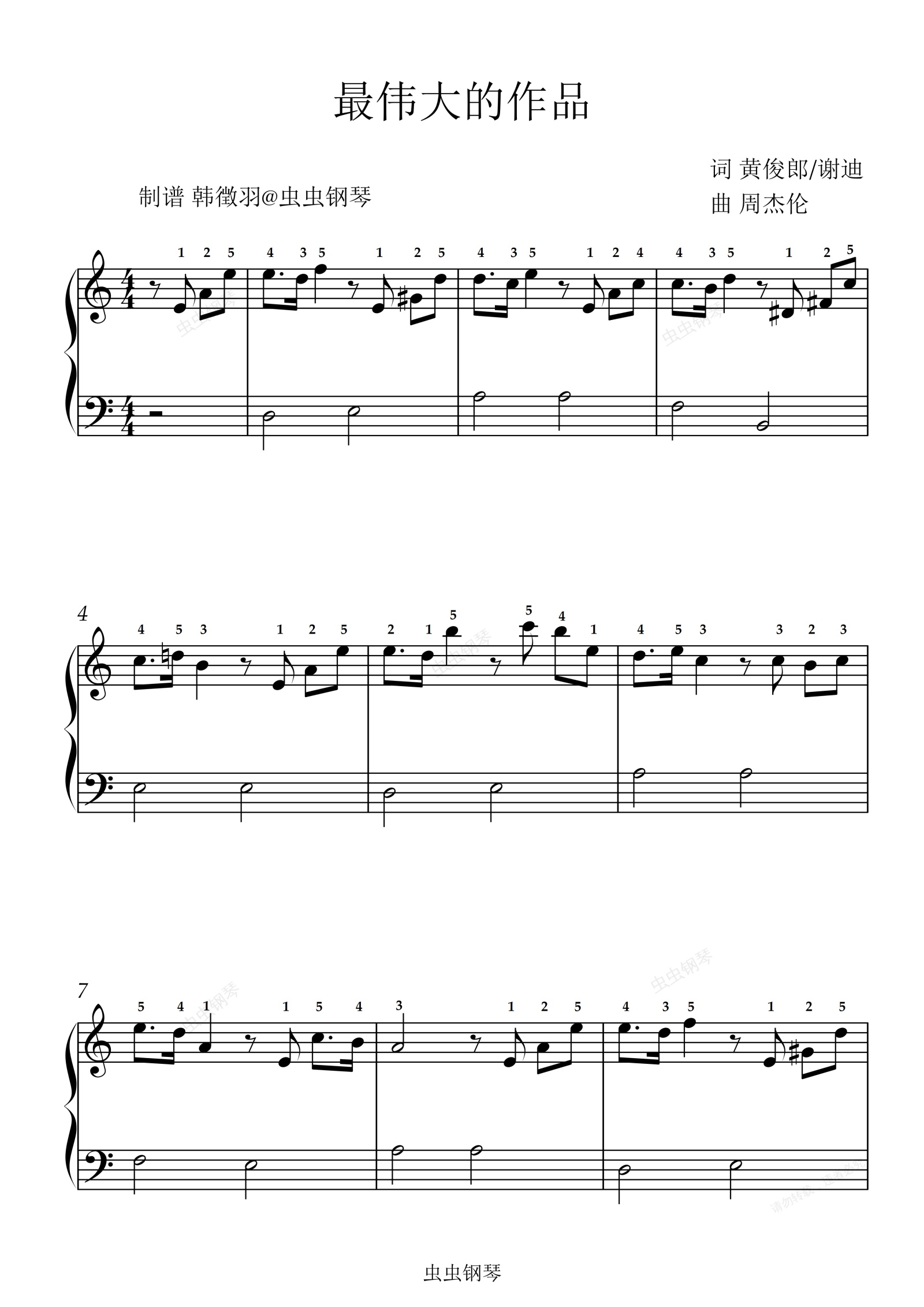 钢琴谱:最伟大的作品 C调简易版带指法,适合儿童/初学者