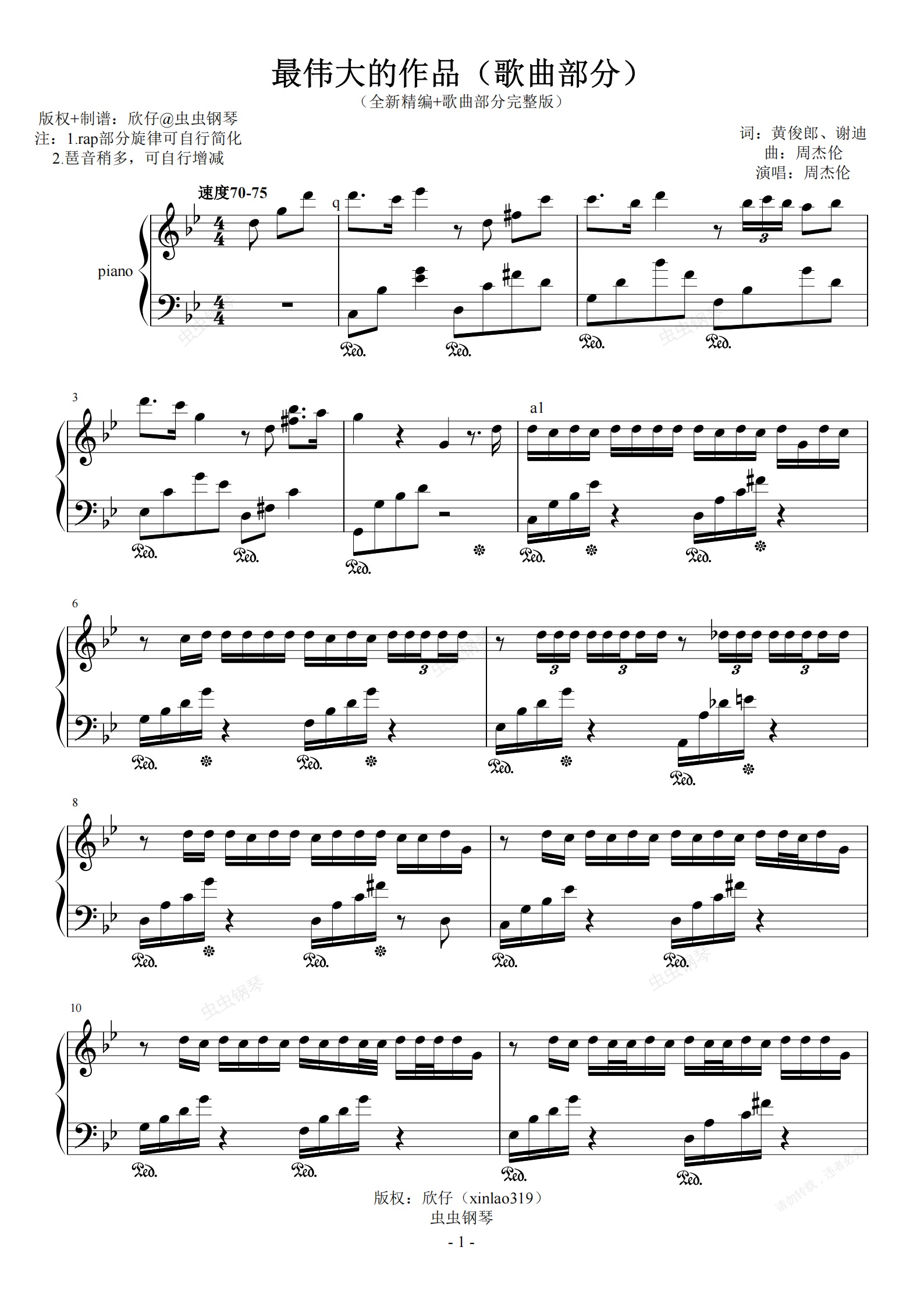 钢琴谱:降B-歌曲部分完整版《最伟大的作品》