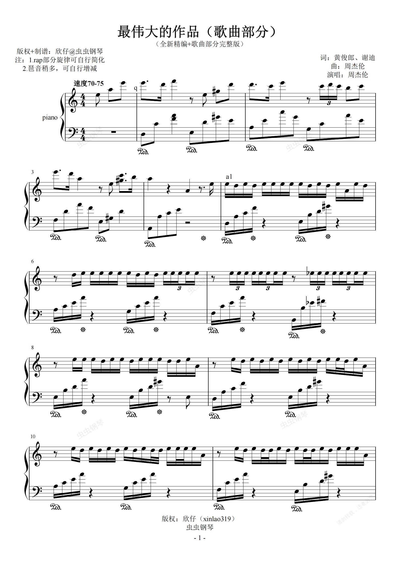 钢琴谱:C-歌曲部分完整版《最伟大的作品》周杰伦