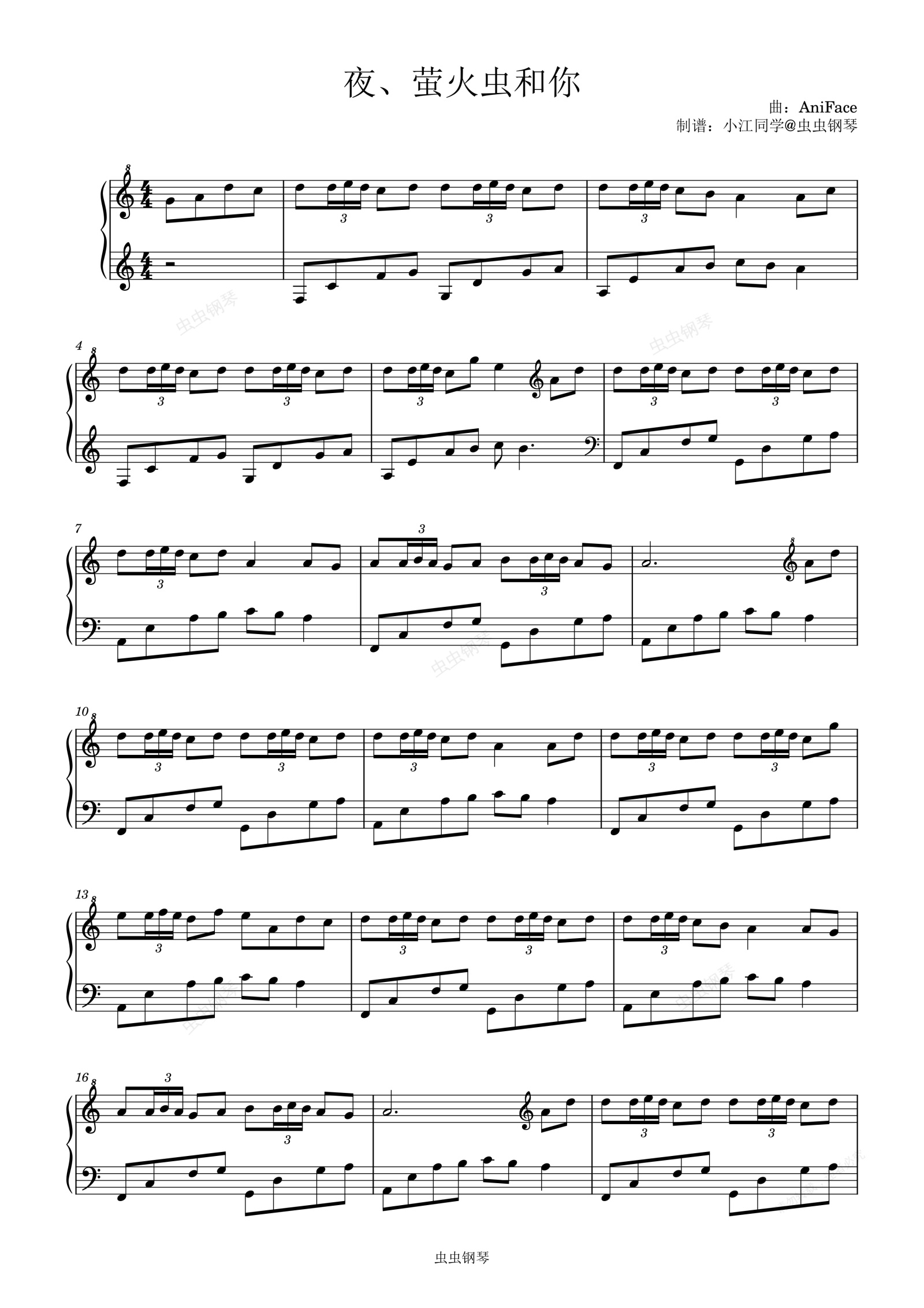 钢琴谱:夜、萤火虫和你 C大调简单版