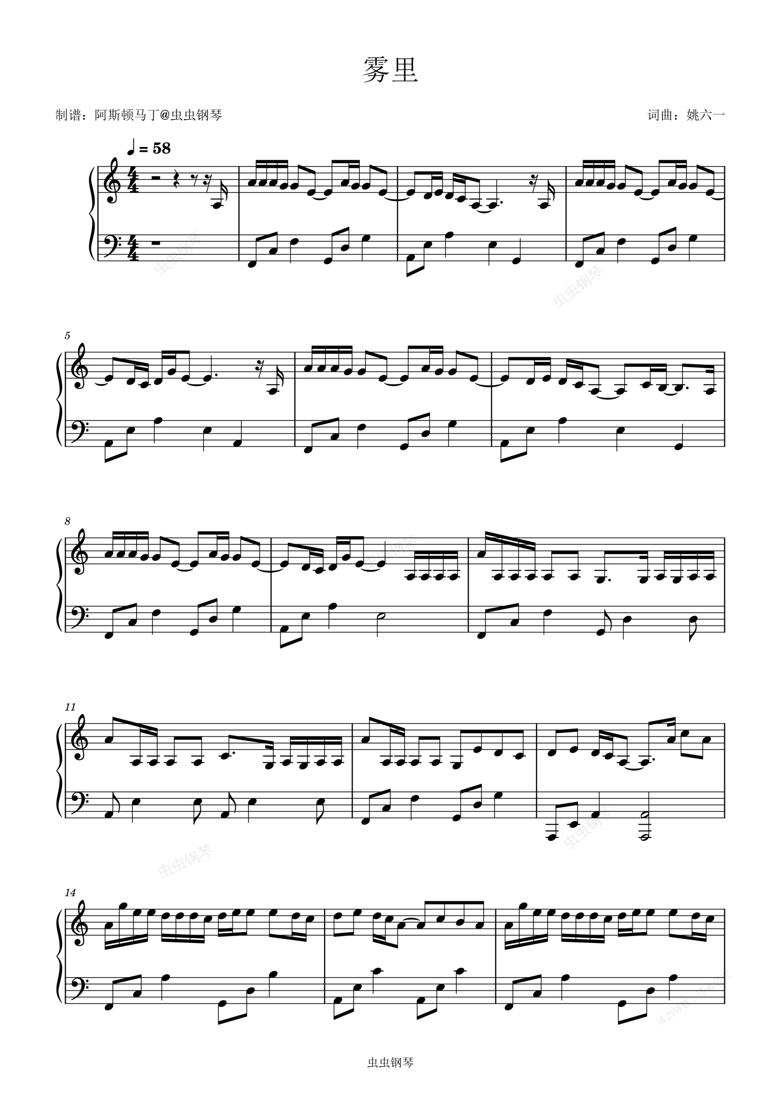 钢琴谱:雾里 - 姚六一【初学简易版】
