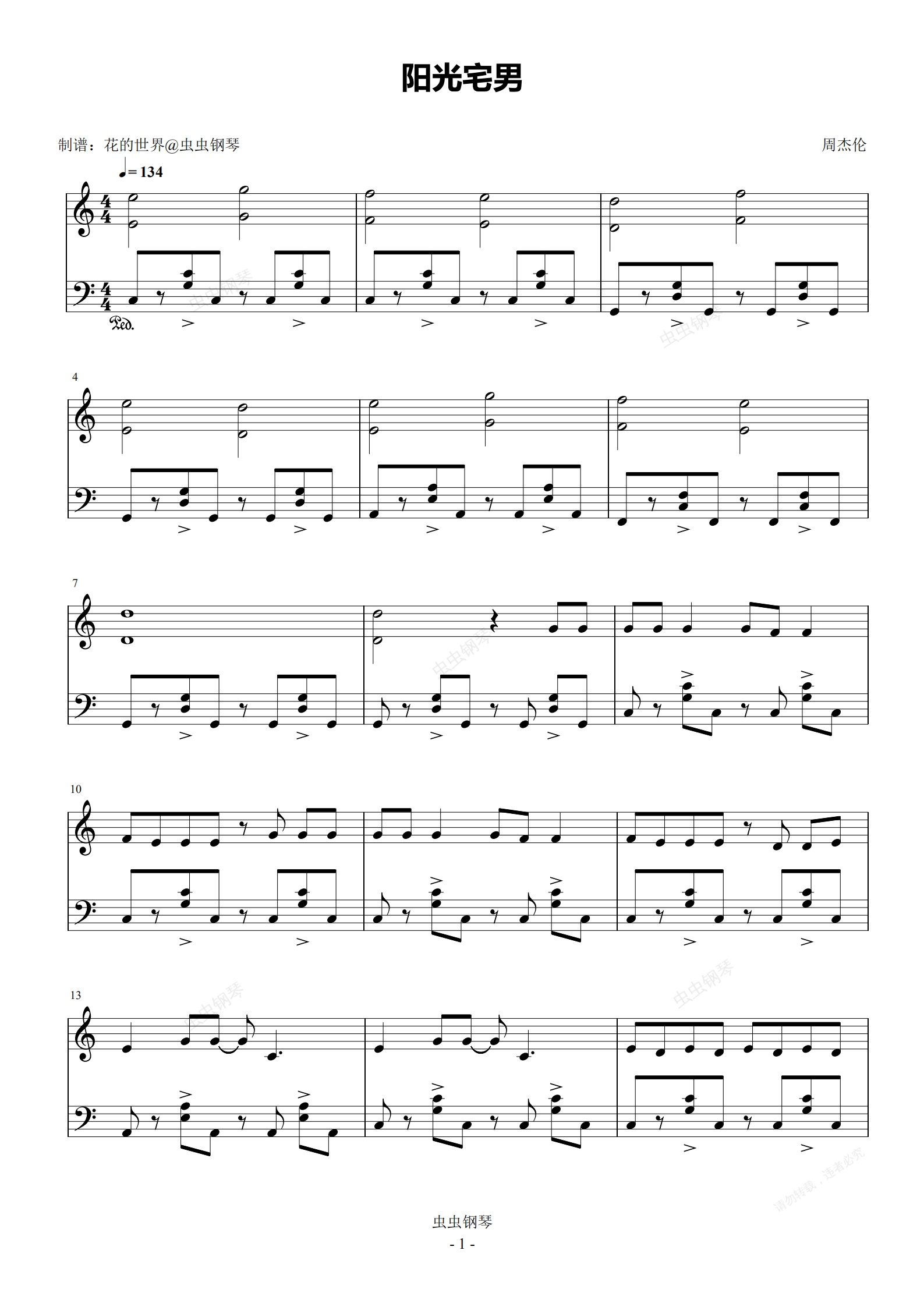 钢琴谱:阳光宅男 C调简易版本 周杰伦