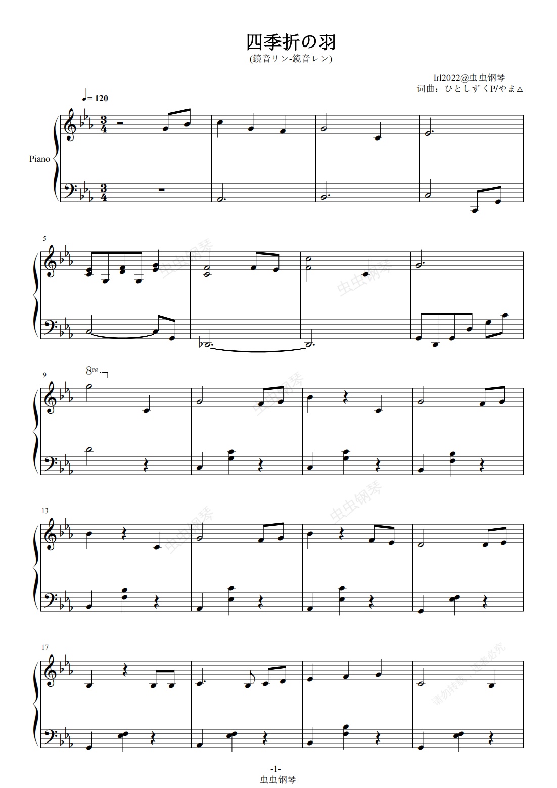 钢琴谱:四季折の羽-四季折之羽-镜音铃 (鏡音リン)/镜音连 (鏡音レン)