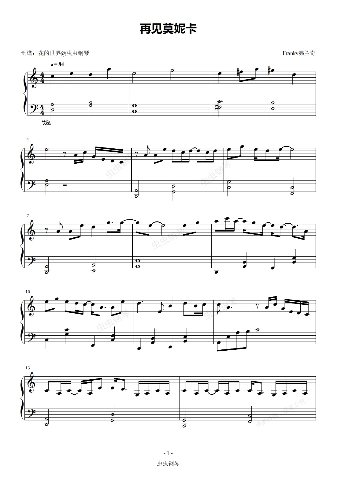 钢琴谱:再见莫妮卡 C调简易版 彭席彦 Franky弗兰奇