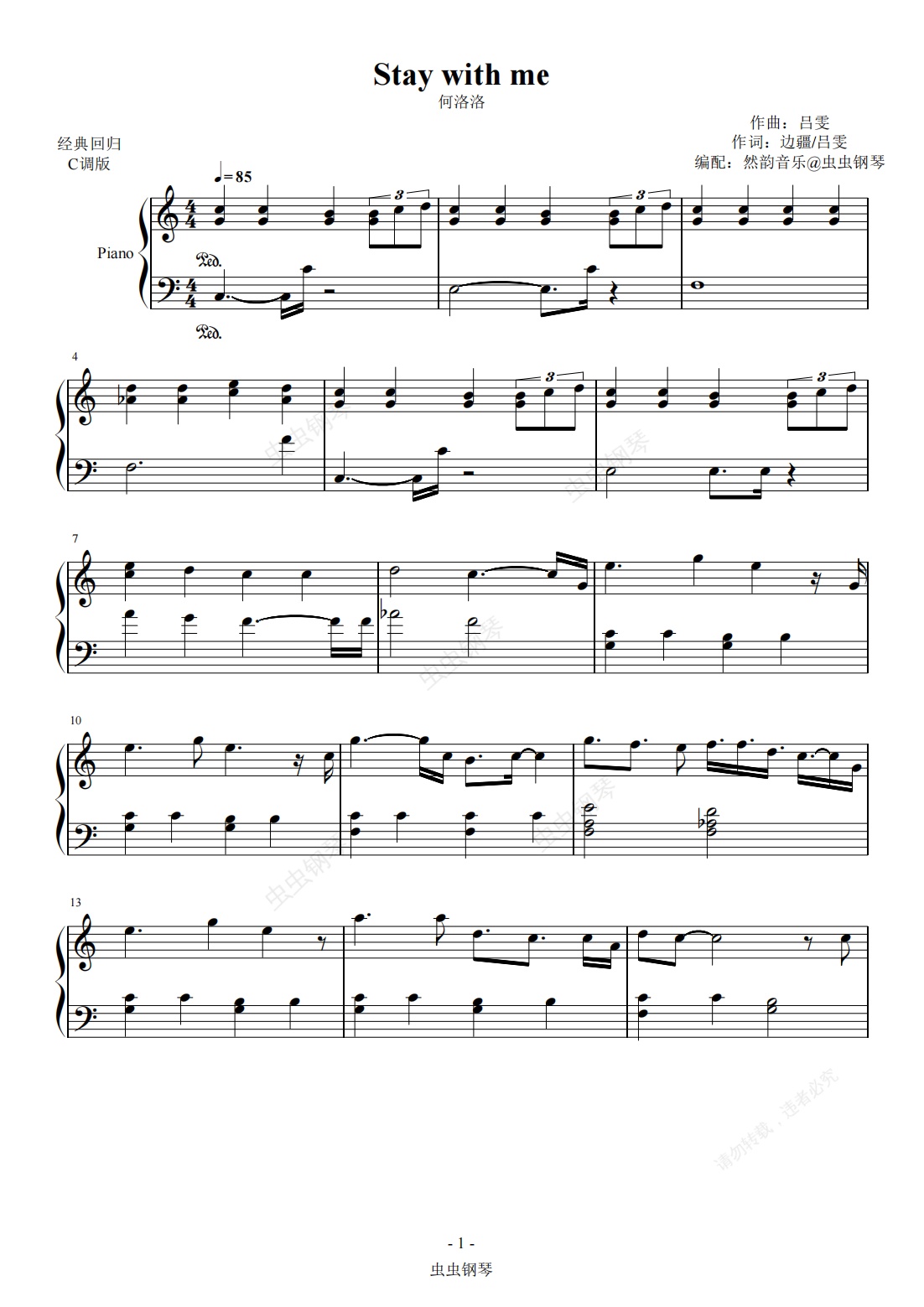 钢琴谱:【C调】Stay with me-何洛洛 完美的他 电视剧原声带