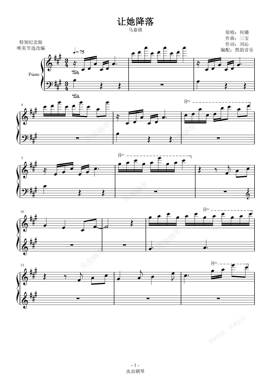 钢琴谱:让她降落-马嘉祺 唯美节选改编 TNT时代少年团