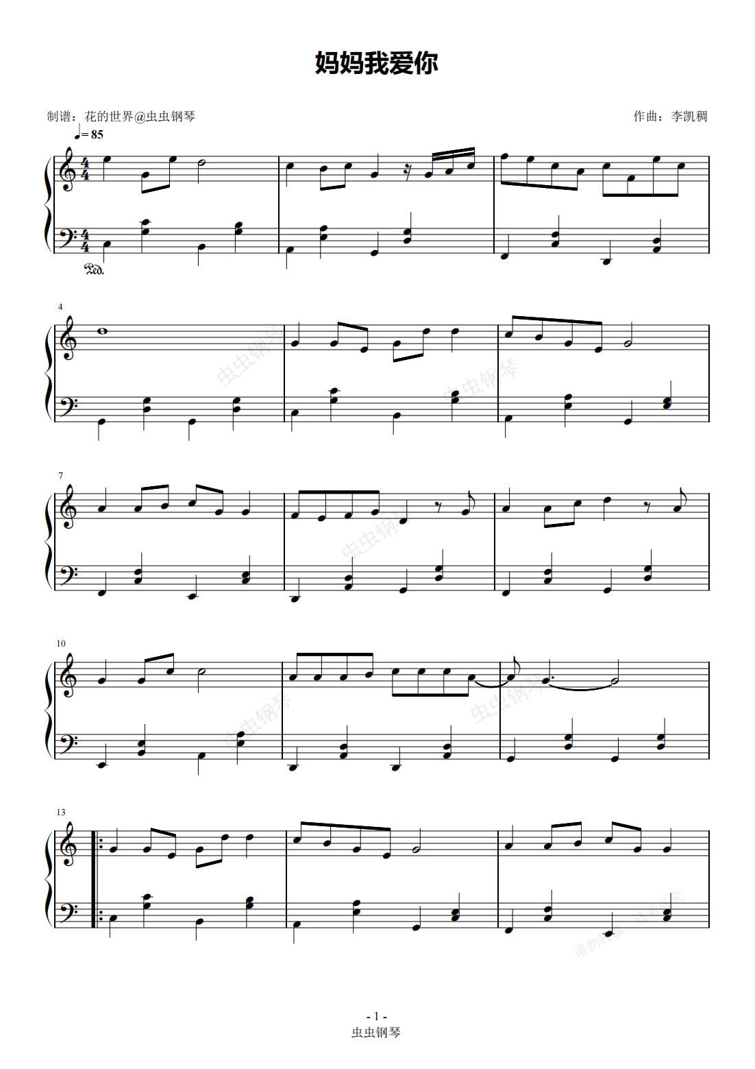 钢琴谱:妈妈我爱你 C调简易版 李昕融