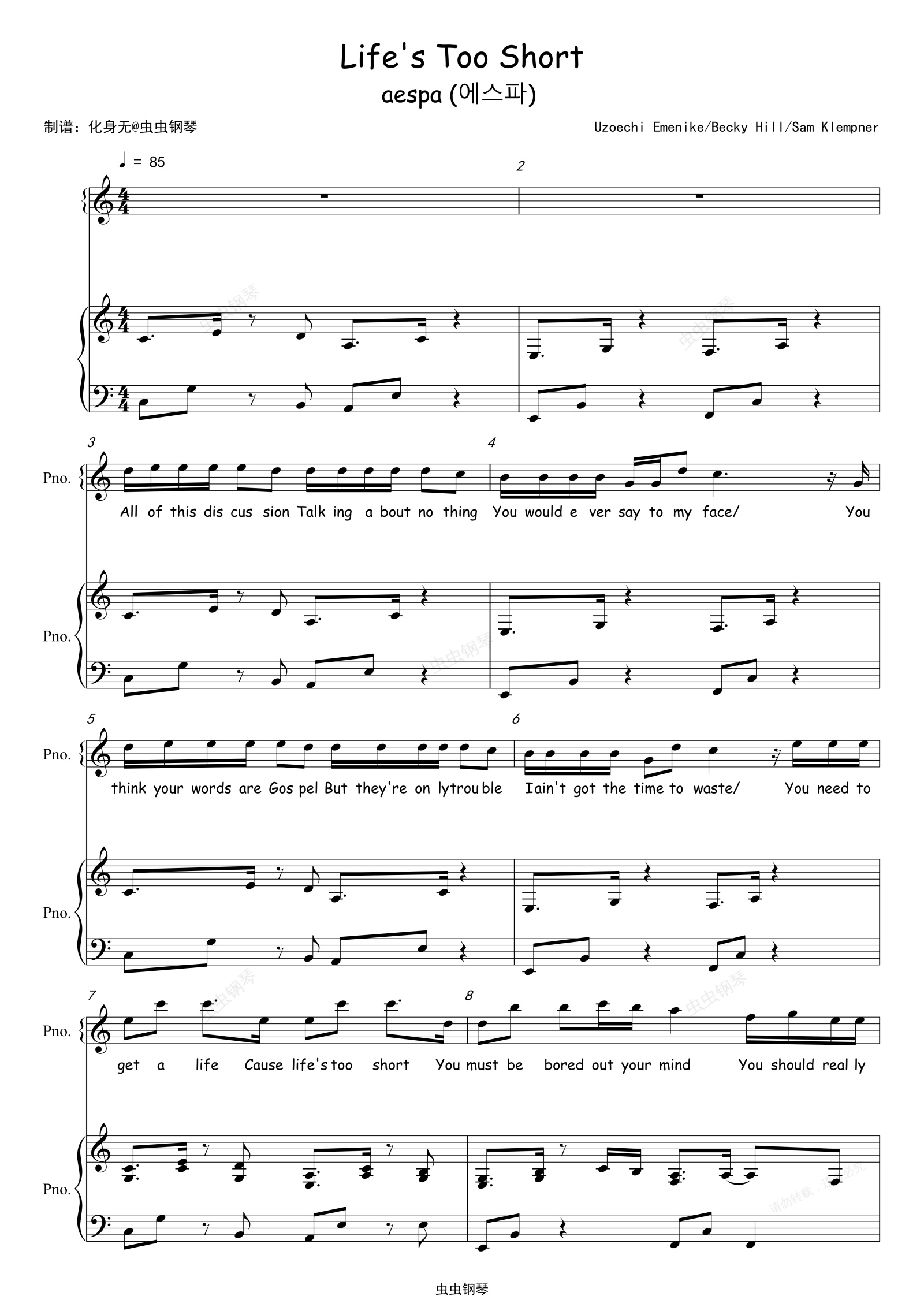 钢琴谱:弹唱版 Life's Too Short (English Ver.)