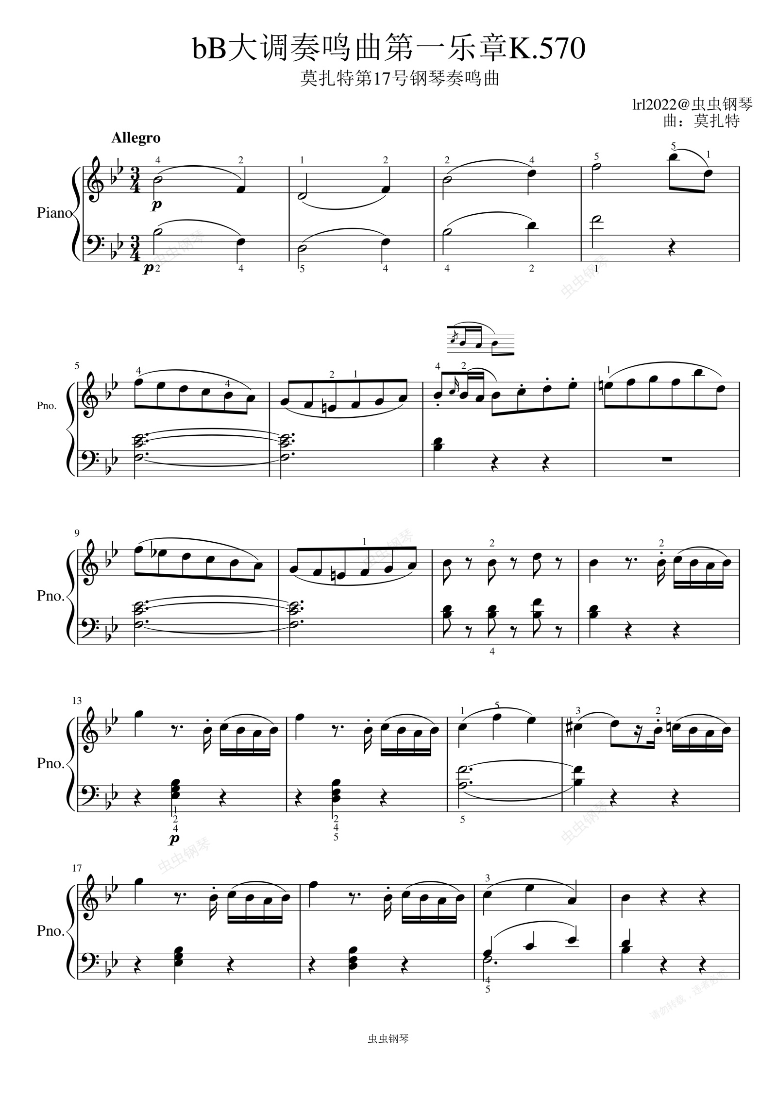 钢琴谱:中音考级-7级-降B大调奏鸣曲第一乐章K.570-详细指法-莫扎特第17号钢琴奏鸣曲