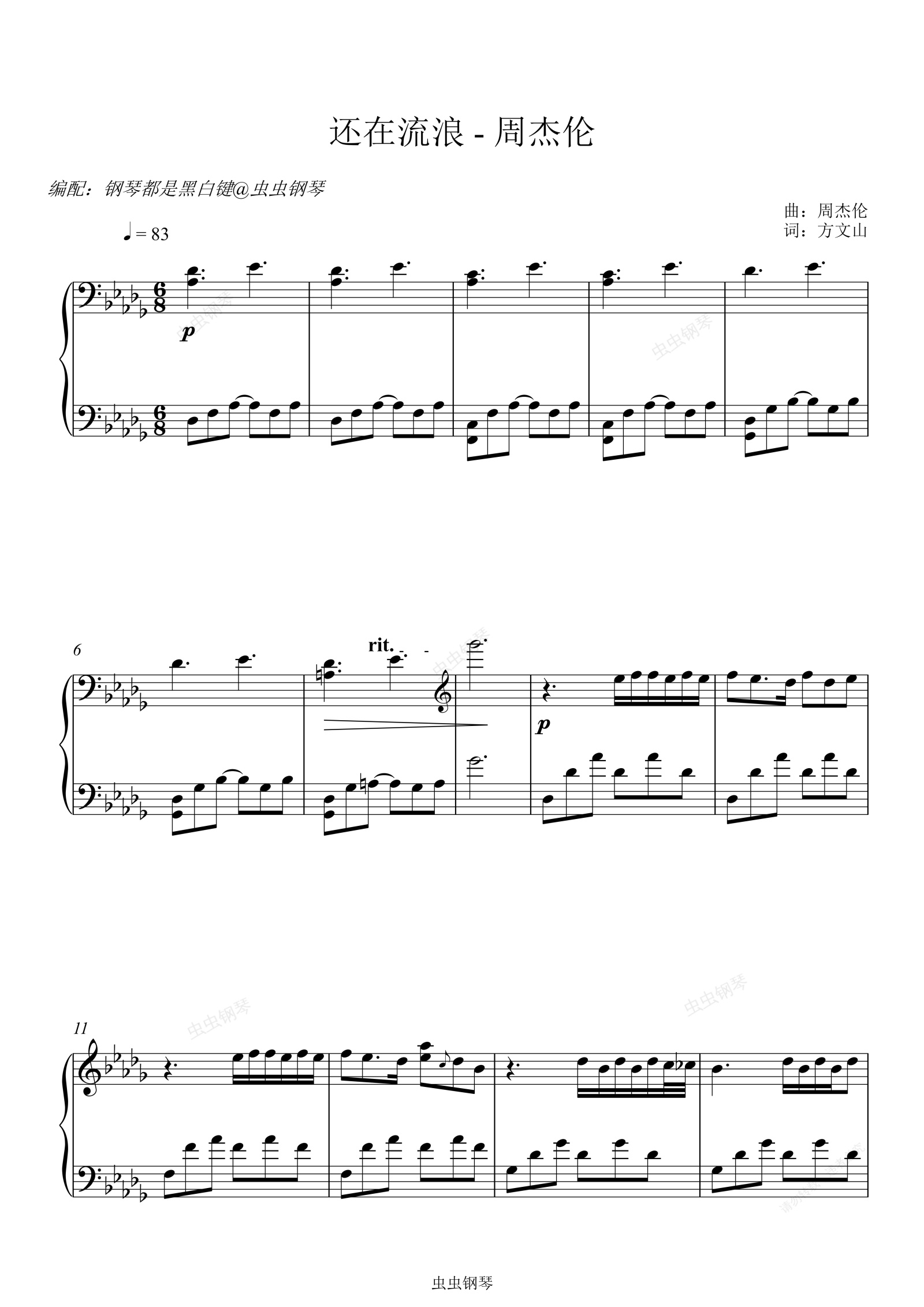 钢琴谱:还在流浪 - 周杰伦 【精编超高还原钢琴独奏】